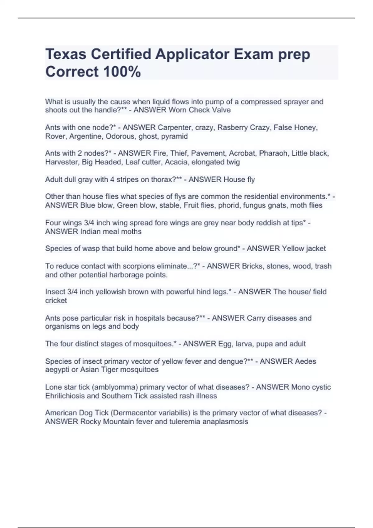 What is usually the cause when liquid flows into pump of a compressed sprayer and shoots out the handle?** - ANSWER Worn Check Valve Ants with one node?* - ANSWER Carpenter, crazy, Rasberry Crazy, False Honey, Rover, Argentine, Odorous, ghost, pyramid Ants with 2 nodes?* - ANSWER Fire, Thief, Pavement, Acrobat, Pharaoh, Little black, Harvester, Big Headed, Leaf cutter, Acacia, elongated twig Adult dull gray with 4 stripes on thorax?** - ANSWER House fly Other than house flies what species of flys are common the residential environments.* - ANSWER Blue blow, Green blow, stable, Fruit flies, phorid, fungus gnats, moth flies Four wings 3/4 inch wing spread fore wings are grey near body reddish at tips* - ANSWER Indian meal moths Species of wasp that build home above and below ground* - ANSWER Yellow jacket To reduce contact with scorpions eliminate...?* - ANSWER Bricks, stones, wood, trash and other potential harborage points. Insect 3/4 inch yellowish brown with powerful hind legs.* - ANSWER The house/ field cricket Ants pose particular risk in hospitals because?** - ANSWER Carry diseases and organisms on legs and body The four distinct stages of mosquitoes.* - ANSWER Egg, larva, pupa and adult Species of insect primary vector of yellow fever and dengue?** - ANSWER Aedes aegypti or Asian Tiger mosquitoes Lone star tick (amblyomma) primary vector of what diseases? - ANSWER Mono cystic Ehrilichiosis and Southern Tick assisted rash illness American Dog Tick (Dermacentor variabilis) is the primary vector of what diseases? - ANSWER Rocky Mountain fever and tuleremia anaplasmosis