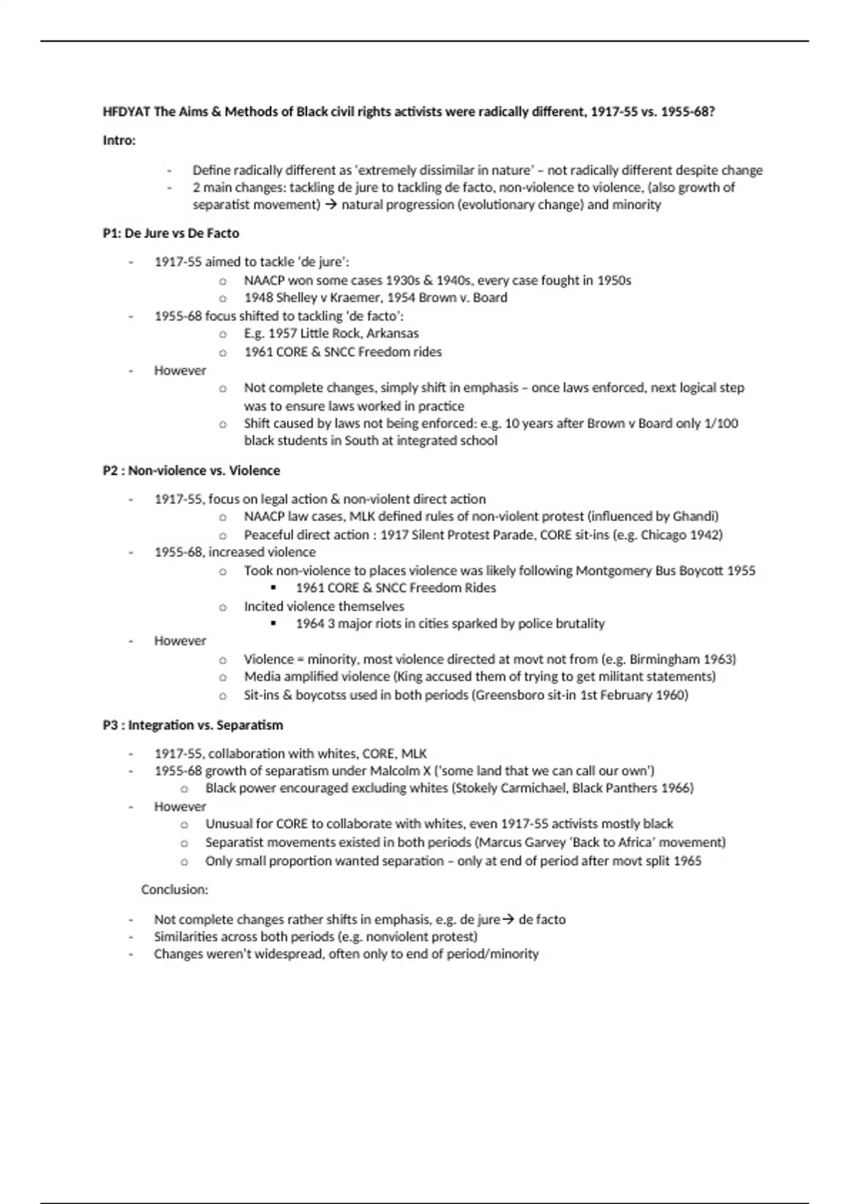 - 2 main changes: tackling de jure to tackling de facto, non-violence to violence, (also growth of
