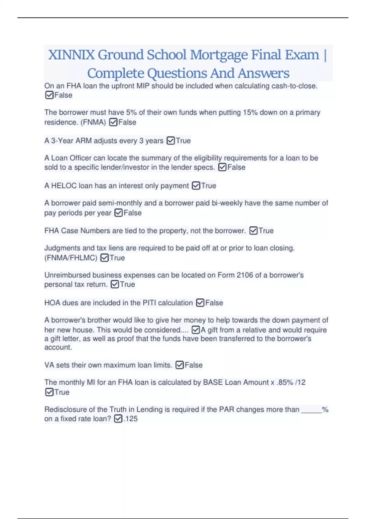 XINNIX Ground School Mortgage Final Exam | Complete Questions And Answers XINNIX Ground School Mortgage Final Exam | Complete Questions And Answers