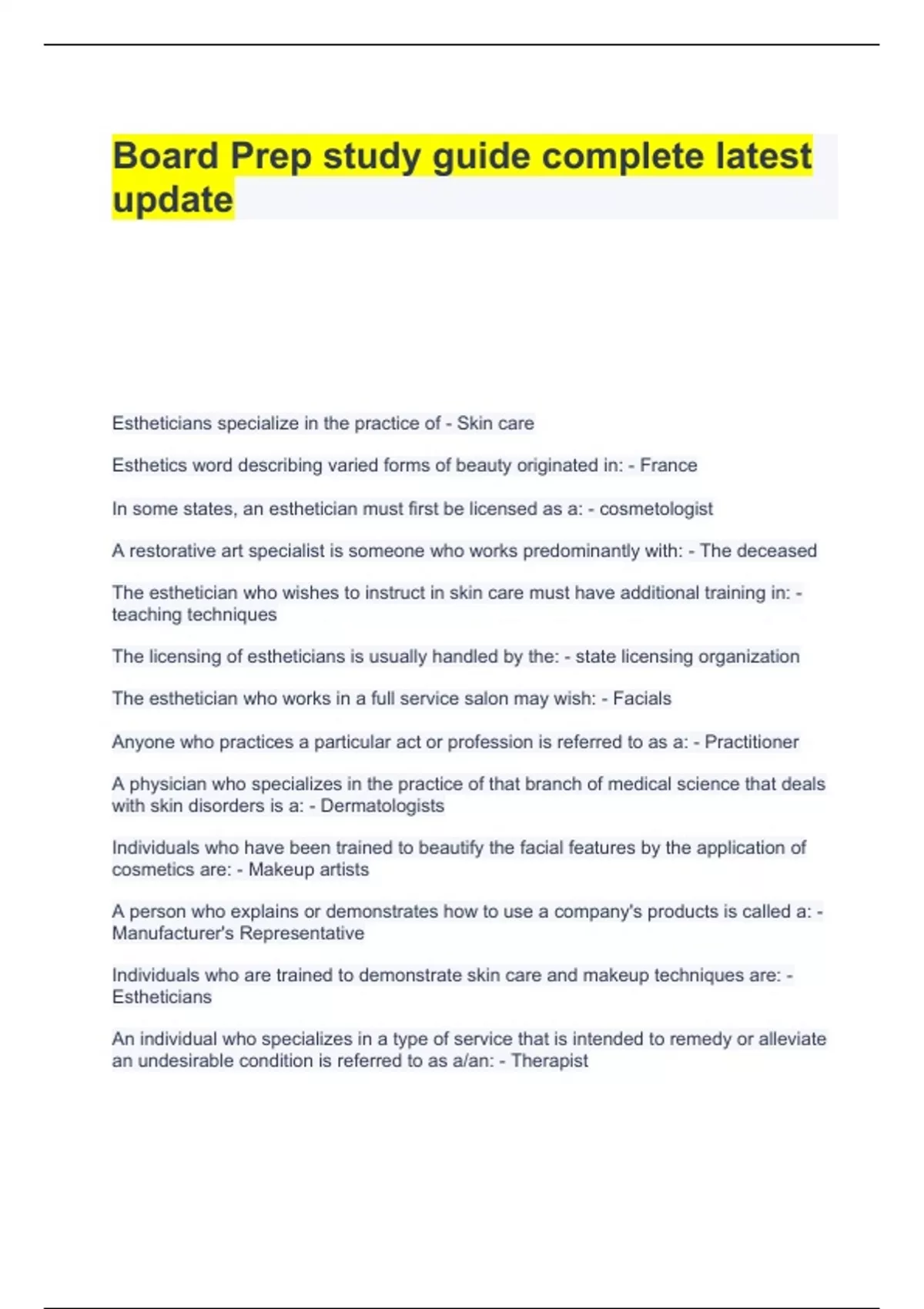 Board Prep study guide complete latest update Estheticians specialize in the practice of - Skin care Esthetics word describing varied forms of beauty originated in: - France In some states, an esthetician must first be licensed as a: - cosmetologist A restorative art specialist is someone who works predominantly with: - The deceased The esthetician who wishes to instruct in skin care must have additional training in: - teaching techniques The licensing of estheticians is usually handled by the: - state licensing organization The esthetician who works in a full service salon may wish: - Facials Anyone who practices a particular act or profession is referred to as a: - Practitioner A physician who specializes in the practice of that branch of medical science that deals with skin disorders is a: - Dermatologists Individuals who have been trained to beautify the facial features by the application of cosmetics are: - Makeup artists A person who explains or demonstrates how to use a company's products is called a: - Manufacturer's Representative Individuals who are trained to demonstrate skin care and makeup techniques are: - Estheticians An individual who specializes in a type of service that is intended to remedy or alleviate an undesirable condition is referred to as a/an: - Therapist A career as an esthetician encourages the free exercise of individual ability and: - Creativity A career in the field of merchandising requires an ability to: - Communicate .................................................continued.............................................
