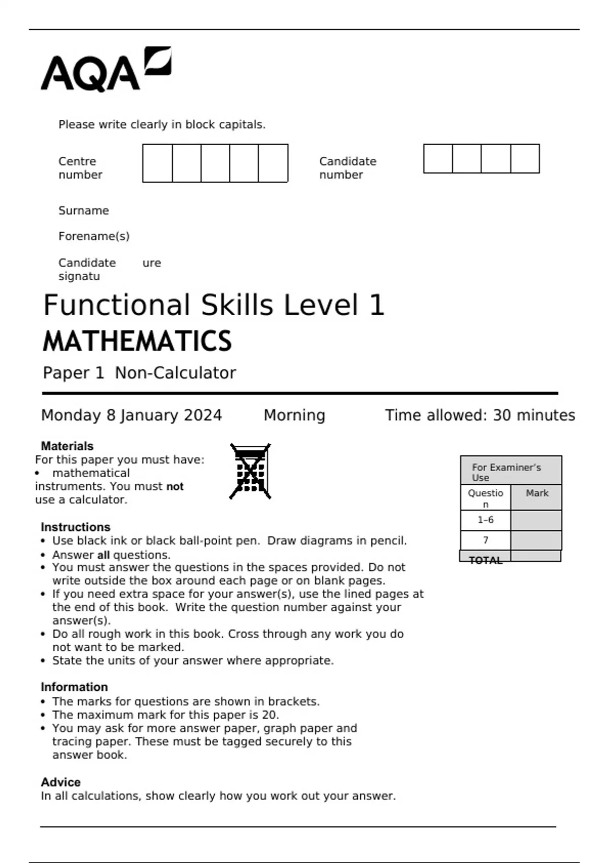 Functional Skills Level 1 MATHEMATICS Paper 1 Non-Calculator Monday 8 January 2024 Morning Time allowed: 30 minutes Materials For this paper you must have: • mathematical instruments. You must not use a calculator. Instructions • Use black ink or black ball-point pen. Draw diagrams in pencil. • Answer all questions. • You must answer the questions in the spaces provided. Do not write outside the box around each page or on blank pages. • If you need extra space for your answer(s), use the lined pages at the end of this book. Write the question number against your answer(s). • Do all rough work in this book. Cross through any work you do not want to be marked. • State the units of your answer where appropriate. Information • The marks for questions are shown in brackets. • The maximum mark for this paper is 20. • You may ask for more answer paper, graph paper and tracing paper. These must be tagged securely to this answer book. Advice In all calculations, show clearly how you work out your answer. 8361/1 Section A Answer all questions in the spaces provided. box 1 Work out 42 Circle your answer. [1 mark] 0.5 6 8 16 2 Work out 1.345 × 100 [1 mark] Answer 3 A fair, ordinary dice is rolled. What is the probability that it lands on an odd number? [1 mark] Answer