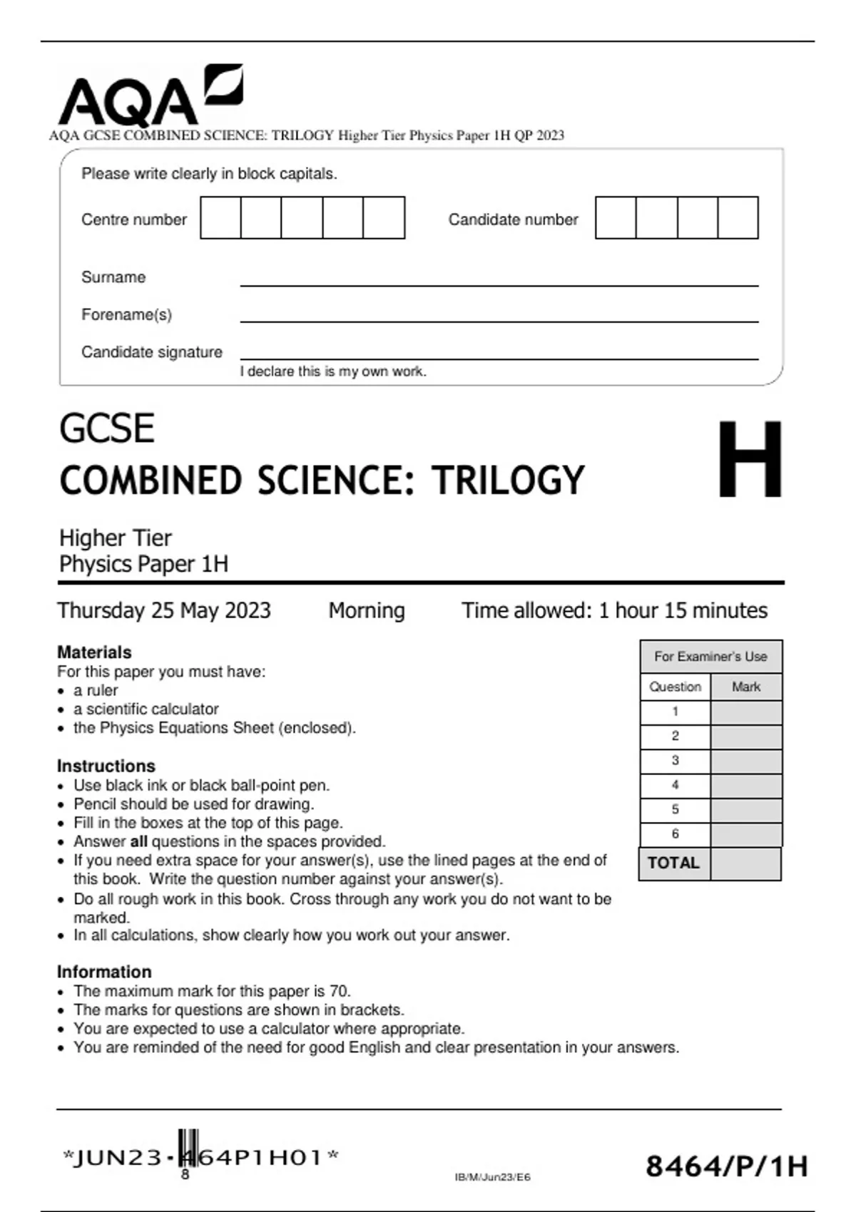 AQA GCSE COMBINED SCIENCE: TRILOGY Higher Tier Physics Paper 1H QP 2023