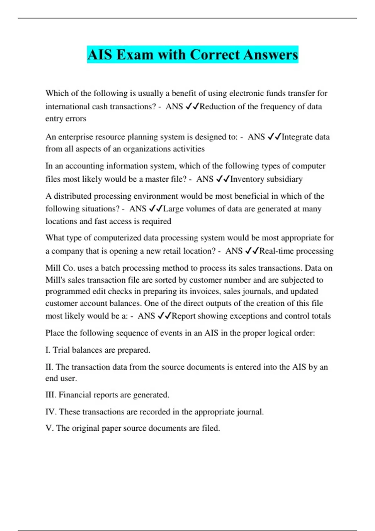 AIS Exam with Correct Answers Which of the following is usually a benefit of using electronic funds transfer for international cash transactions? - ANS ️️ Reduction of the frequency of data entry errors An enterprise resource planning system is designed to: - ANS ️️ Integrate data from all aspects of an organizations activities In an accounting information system, which of the following types of computer files most likely would be a master file? - ANS ️️ Inventory subsidiary A distributed processing environment would be most beneficial in which of the following situations? - ANS ️️ Large volumes of data are generated at many locations and fast access is required What type of computerized data processing system would be most appropriate for a company that is opening a new retail location? - ANS ️️ Real-time processing Mill Co. uses a batch processing method to process its sales transactions. Data on Mill's sales transaction file are sorted by customer number and are subjected to programmed edit checks in preparing its invoices, sales journals, and updated customer account balances. One of the direct outputs of the creation of this file most likely would be a: - ANS ️️ Report showing exceptions and control totals Place the following sequence of events in an AIS in the proper logical order: I. Trial balances are prepared. II. The transaction data from the source documents is entered into the AIS by an end user. III. Financial reports are generated. IV. These transactions are recorded in the appropriate journal. V. The original paper source documents are filed.