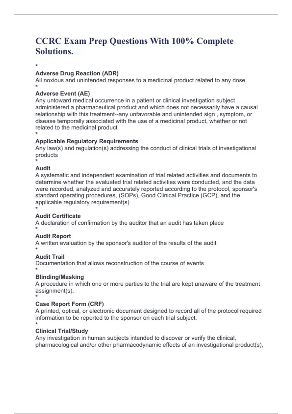CCRC Exam Prep Questions With 100% Complete Solutions. * Adverse Drug Reaction (ADR) All noxious and unintended responses to a medicinal product related to any dose * Adverse Event (AE) Any untoward medical occurrence in a patient or clinical investigation subject administered a pharmaceutical product and which does not necessarily have a causal relationship with this treatment--any unfavorable and unintended sign , symptom, or disease temporally associated with the use of a medicinal product, whether or not related to the medicinal product * Applicable Regulatory Requirements Any law(s) and regulation(s) addressing the conduct of clinical trials of investigational products * Audit A systematic and independent examination of trial related activities and documents to determine whether the evaluated trial related activities were conducted, and the data were recorded, analyzed and accurately reported according to the protocol, sponsor's standard operating procedures, (SOPs), Good Clinical Practice (GCP), and the applicable regulatory requirement(s) * Audit Certificate