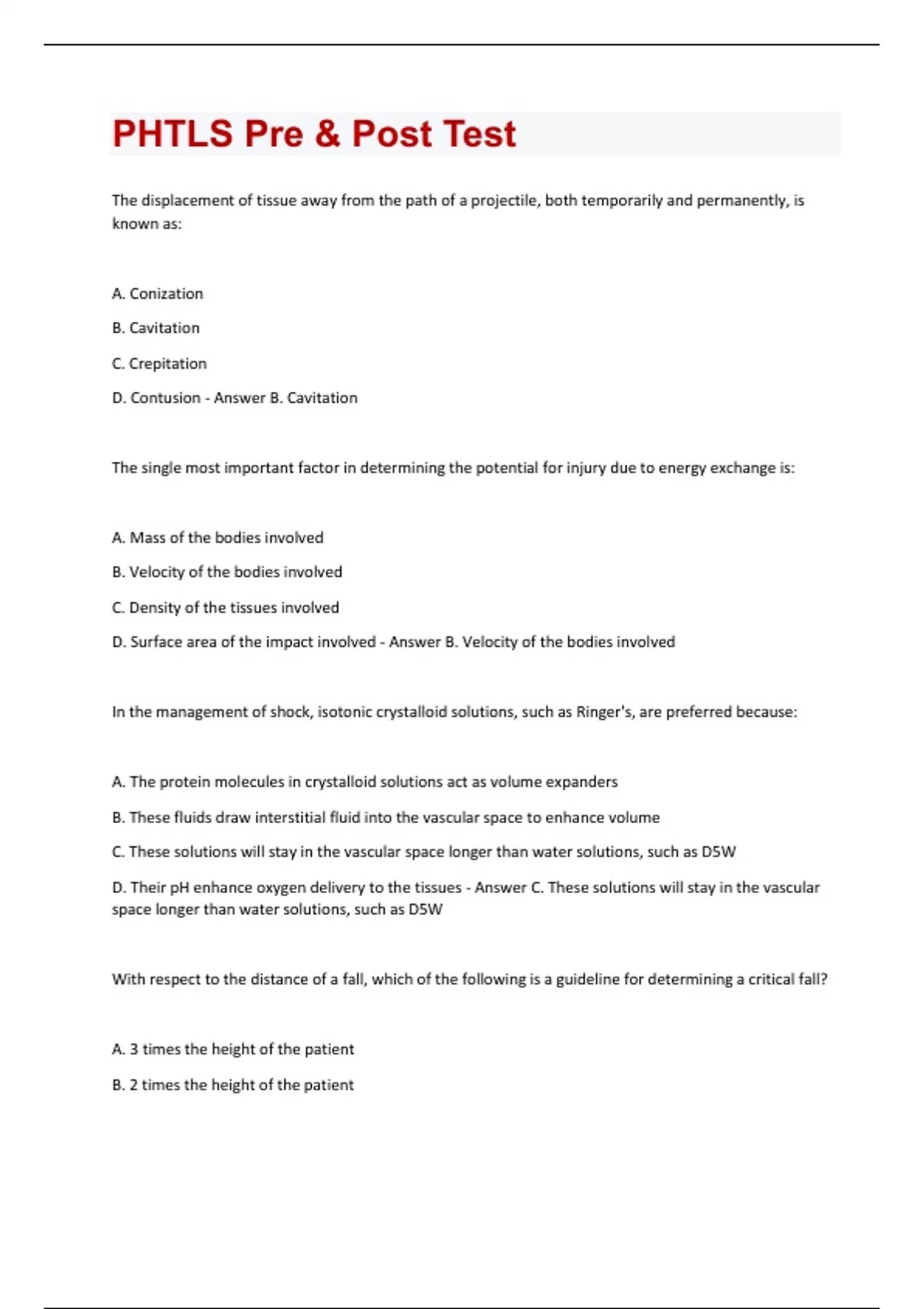 The displacement of tissue away from the path of a projectile, both temporarily and permanently, is known as: A. Conization B. Cavitation C. Crepitation D. Contusion - Answer B. Cavitation The single most important factor in determining the potential for injury due to energy exchange is: A. Mass of the bodies involved B. Velocity of the bodies involved C. Density of the tissues involved D. Surface area of the impact involved - Answer B. Velocity of the bodies involved In the management of shock, isotonic crystalloid solutions, such as Ringer's, are preferred because: A. The protein molecules in crystalloid solutions act as volume expanders B. These fluids draw interstitial fluid into the vascular space to enhance volume C. These solutions will stay in the vascular space longer than water solutions, such as D5W D. Their pH enhance oxygen delivery to the tissues - Answer C. These solutions will stay in the vascular space longer than water solutions, such as D5W With respect to the distance of a fall, which of the following is a guideline for determining a critical fall? A. 3 times the height of the patient B. 2 times the height of the patientC. 5 times the height of the patient D. 1 ½ times the height of the patient - Answer A. 3 times the height of the patient The phase of an explosion, or blast, in which hollow organs are squeezed and may rupture is called the __________ phase. A. Tertiary phase B. Quaternary phase C. Secondary phase D. Primary phase - Answer D. Primary phase During the primary survey and management of a trauma patient, the E in ABCDE stands for _________? A. Edema B. Eyes & ears C. Expose/Environment D. Electrical therapy - Answer C. Expose/Environment The time in which surgical intervention can make a difference in patient outcome is the __________? A. Golden period B. Golden time C. Golden era D. Golden minutes - Answer A. Golden period (hour)