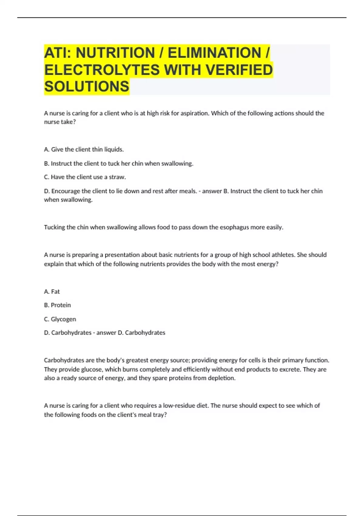ATI NUTRITION ELIMINATION ELECTROLYTES WITH VERIFIED SOLUTIONS.