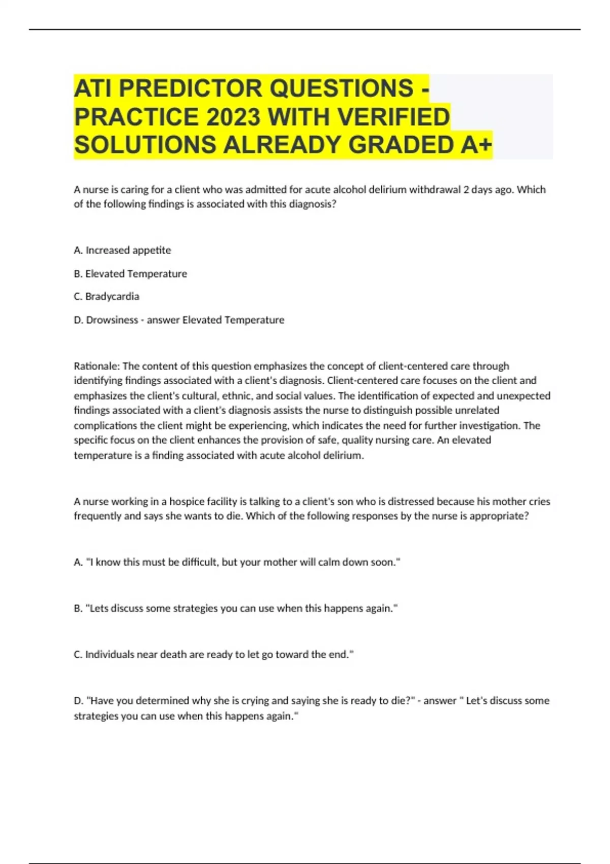 ATI PREDICTOR QUESTIONS - PRACTICE 2023 WITH VERIFIED SOLUTIONS ALREADY GRADED A+.