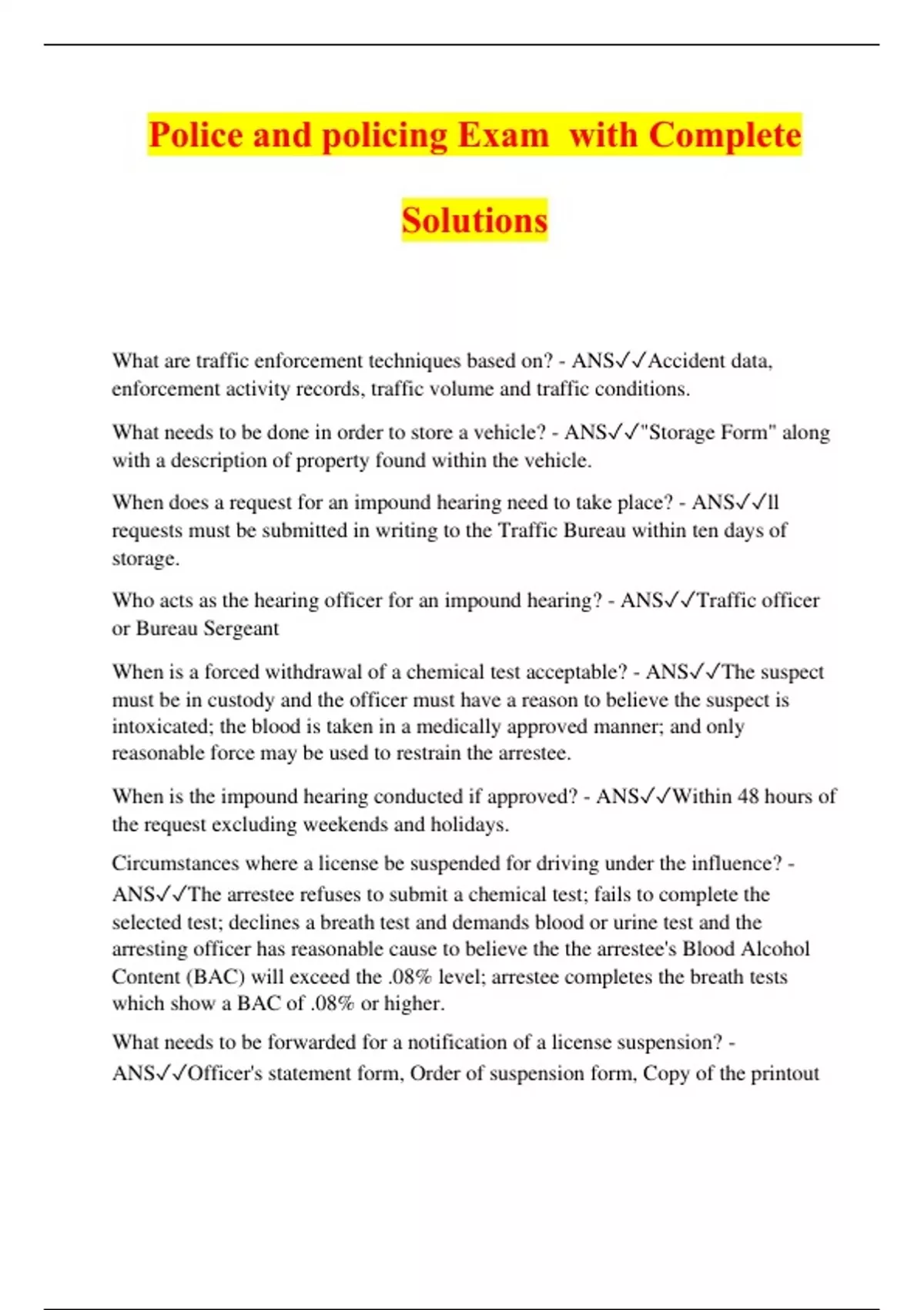 Police and policing Exam with Complete Solutions What are traffic enforcement techniques based on? - ANSAccident data, enforcement activity records, traffic volume and traffic conditions. What needs to be done in order to store a vehicle? - ANS"Storage Form" along with a description of property found within the vehicle. When does a request for an impound hearing need to take place? - ANSll requests must be submitted in writing to the Traffic Bureau within ten days of storage. Who acts as the hearing officer for an impound hearing? - ANSTraffic officer or Bureau Sergeant When is a forced withdrawal of a chemical test acceptable? - ANSThe suspect must be in custody and the officer must have a reason to believe the suspect is intoxicated; the blood is taken in a medically approved manner; and only reasonable force may be used to restrain the arrestee. When is the impound hearing conducted if approved? - ANSWithin 48 hours of the request excluding weekends and holidays. Circumstances where a license be suspended for driving under the influence? - ANSThe arrestee refuses to submit a chemical test; fails to complete the selected test; declines a breath test and demands blood or urine test and the arresting officer has reasonable cause to believe the the arrestee's Blood Alcohol Content (BAC) will exceed the .08% level; arrestee completes the breath tests which show a BAC of .08% or higher. What needs to be forwarded for a notification of a license suspension? - ANSOfficer's statement form, Order of sus