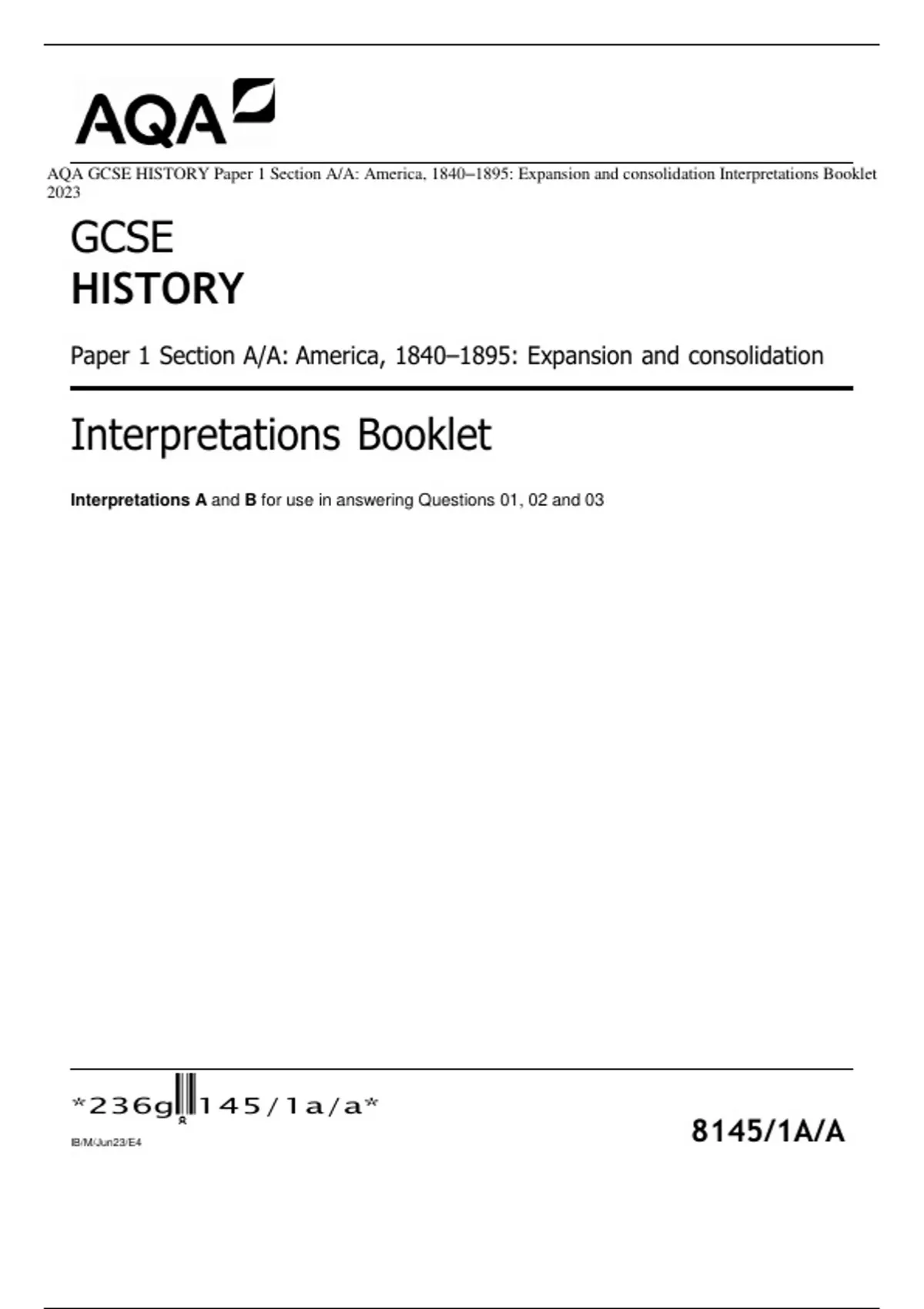 AQA GCSE HISTORY Paper 1 Section A/A: America, 1840–1895: Expansion and consolidation Interpretations Booklet 2023