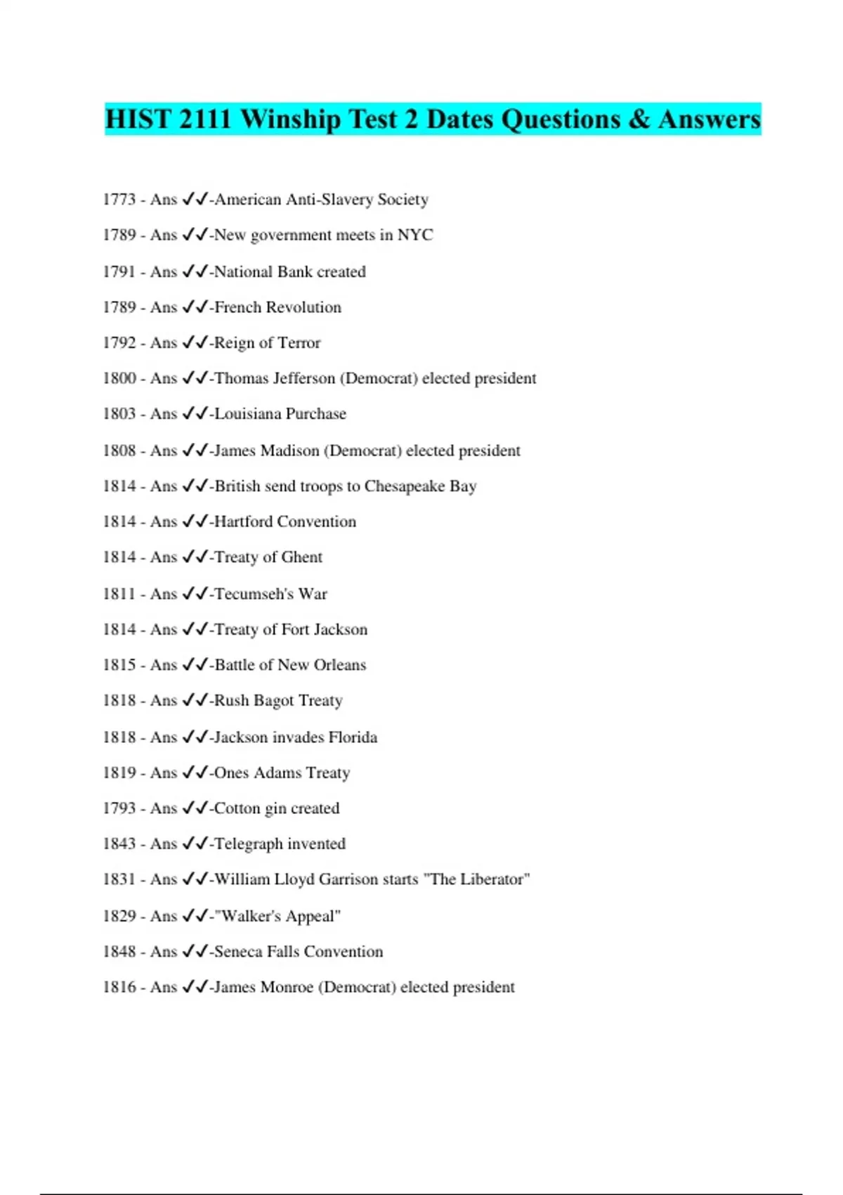HIST 2111 Winship Test 2 Dates Questions & Answers 1773 - Ans ️️ -American Anti-Slavery Society 1789 - Ans ️️ -New government meets in NYC 1791 - Ans ️️ -National Bank created 1789 - Ans ️️ -French Revolution 1792 - Ans ️️ -Reign of Terror 1800 - Ans ️️ -Thomas Jefferson (Democrat) elected president 1803 - Ans ️️ -Louisiana Purchase 1808 - Ans ️️ -James Madison (Democrat) elected president 1814 - Ans ️️ -British send troops to Chesapeake Bay 1814 - Ans ️️ -Hartford Convention 1814 - Ans ️️ -Treaty of Ghent 1811 - Ans ️️ -Tecumseh's War 1814 - Ans ️️ -Treaty of Fort Jackson 1815 - Ans ️️ -Battle of New Orleans 1818 - Ans ️️ -Rush Bagot Treaty 1818 - Ans ️️ -Jackson invades Florida 1819 - Ans ️️ -Ones Adams Treaty