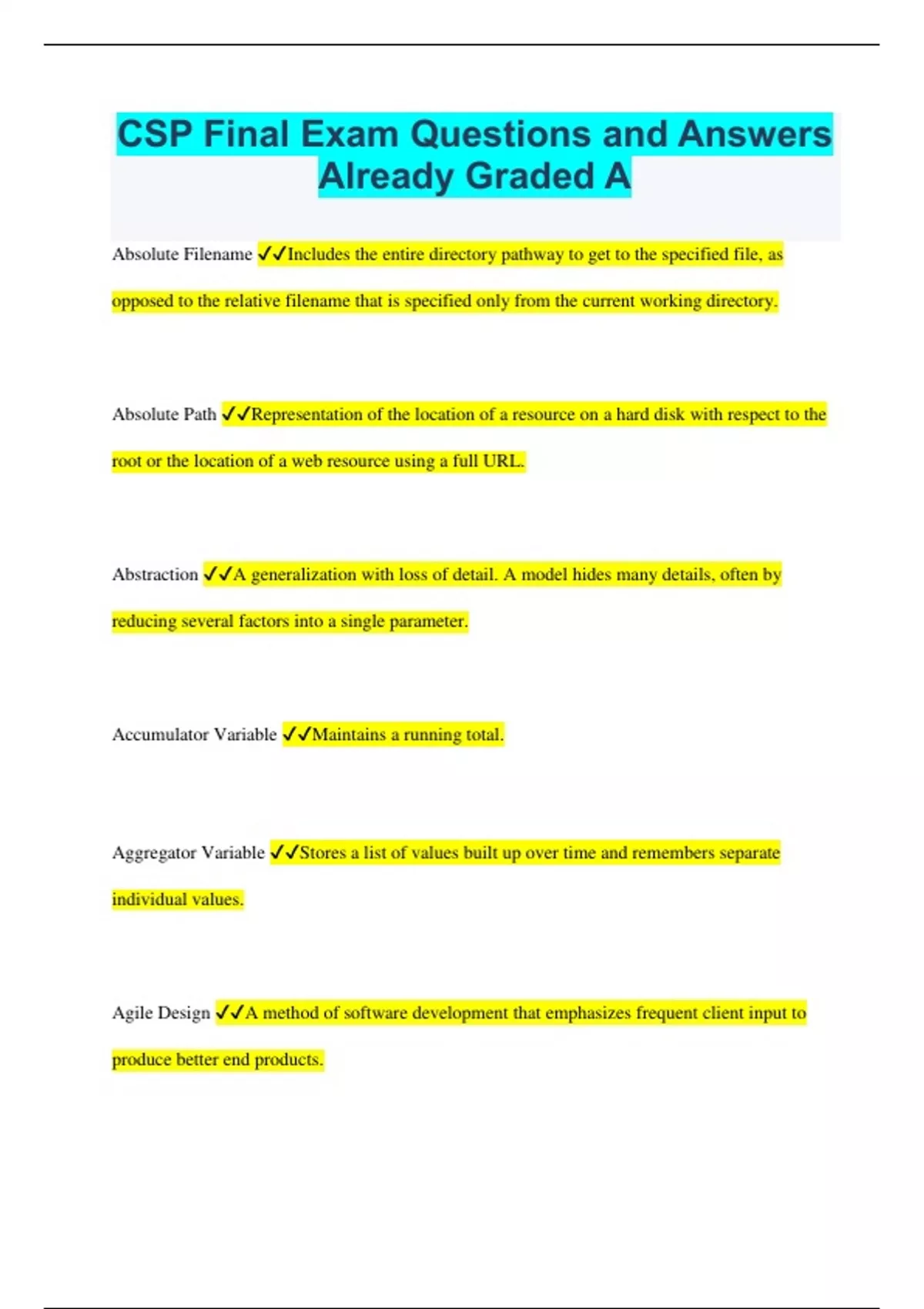 CSP Final Exam Questions and Answers Already Graded A Absolute Filename Includes the entire directory pathway to get to the specified file, as opposed to the relative filename that is specified only from the current working directory. Absolute Path Representation of the location of a resource on a hard disk with respect to the root or the location of a web resource using a full URL. Abstraction A generalization with loss of detail. A model hides many details, often by reducing several factors into a single parameter. Accumulator Variable Maintains a running total. Aggregator Variable Stores a list of values built up over time and remembers separate individual values. Agile Design A method of software development that emphasizes frequent client input to produce better end products. Algorithm A step-by-step procedure, like a recipe, but often involving decisions. Alpha channel Part of a pixel's data that tells how opaque or transparent that color should appear when the graphics card calculates how to render the image on screen. Application A program run by the operating system to meet particular needs of a user. Arguments The values that the programmer provides in the function call. Array An ordered collection of elements of the same type. Assignment Operator The '=' character causes the compiler or interpreter to evaluate to the expression on its right and store the result in the variable(s) on its left. Best-so-far Variable Keeps track of a record best or worst and updates when a new record best or worst has been reached. Binary The binary number system is base 2, using only bits 0 and 1. Bit A single unit of binary consisting of only one place whose value can be 0 or 1. Browser A piece of software that renders web pages and allows users to view resources on a network. Built-in Function The set of functions available to the programmer without the need to use any "import" or "include" statements. Byte Eight bits, able to represent 256 distinct values. Abbreviated "b". Central Processing Unit (CPU, or core) The part of the computer that executes one instruction at a time. computer and information technology A group of computing careers focusing on the use of computers to store and manipulate data. Concatenation Attaching two things side-by-side, frequently strings of text. Conditional The Boolean expression in an if-structure that is evaluated to determine which branch of code to execute. Current working directory A location in the file system used as a point of reference for any command in a particular window or in a particular shell's command line. Digital Data which can only take on discrete values. Opposite of analog. Event Handler A piece of code that responds to an event. Fixed Variable Stores a value that will not change over the course of the entire program. Float A native type representing rational numbers to limited precision. Hexadecimal The hexadecimal number system is base 16, using only digits 0, 1, 2, 3, 4, 5, 6, 7, 8, 9, A, B, C, D, E, and F. Human-Computer Interaction The study of how humans give input to and receive output from a computer. If-structure Evaluates a Boolean expression and executes some code if the expression is true (and possibly other code if it is false). Import In Python import is a key word for using one module of code from inside another module. Int A native type representing the integers, which are positive whole numbers and their opposites. Integrated Development Environment (IDE) Provides a developer with a way to create a program, run the program, and debug the program all within one application. Linux Linux is a free, open source operating system in the UNIX family of operating systems. Memory The parts of computer that can store data or instruction, including volatile memory (lost when the computer is turned off) and non-volatile memory (retained when the computer is turned off). Multi-line Comment Denoted by either ''', or """ these can generate docstrings and allow the programmer to leave notes in code that span several lines without having to type '#' at the beginning of each line. Output The effect that a program has on its environment. Pseudocode An outline of the basic ideas behind how algorithms will work. Quadratic Function A function like f(x) = y = 5x2 + 7x +3 that has an x2 term but no power higher than two. Scrum The most common framework for Agile Development. String A native type in Python representing a sequence of characters. Strings are both iterable and immutable. Variable Roles Describe why a variable is being used in a program. Version Control A process to keep track of what changes were made to what files so that a specific version can be referred to and improvements in multiple versions can be merged together. Walker Variable Stores one item from a list at a time during iteration. Working Directory The directory in the file system you are currently "in". BASH Bourne Again Shell -- Command Line Interface for Linux. Traceback A list of function calls that were made before an exception stopped the program. API An Application Programming Interface is a way programmers share their code with other programmers. In object-oriented libraries, an API specifies the methods of each class. Object-oriented A paradigm for programming in which code describes a class with methods, including a method for creating an object in the class. Method A set of instructions grouped together to do something to or with an object. Class An abstraction defining a type of object, with methods (instructions that can be executed) and attributes (variables to store data).
