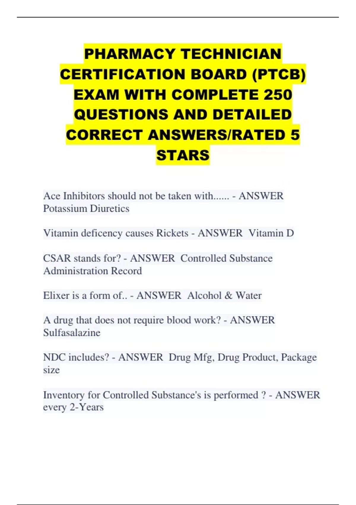 PHARMACY TECHNICIAN CERTIFICATION BOARD (PTCB) EXAM WITH COMPLETE 250 QUESTIONS AND DETAILED CORRECT ANSWERS/RATED 5 STARS