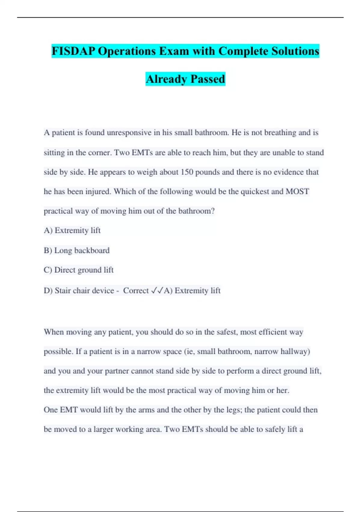 A patient is found unresponsive in his small bathroom. He is not breathing and is sitting in the corner. Two EMTs are able to reach him, but they are unable to stand side by side. He appears to weigh about 150 pounds and there is no evidence that he has been injured. Which of the following would be the quickest and MOST practical way of moving him out of the bathroom? A) Extremity lift B) Long backboard C) Direct ground lift D) Stair chair device - Correct A) Extremity lift When moving any patient, you should do so in the safest, most efficient way possible. If a patient is in a narrow space (ie, small bathroom, narrow hallway) and you and your partner cannot stand side by side to perform a direct ground lift, the extremity lift would be the most practical way of moving him or her. One EMT would lift by the arms and the other by the legs; the patient could then be moved to a larger working area. Two EMTs should be able to safely lift a