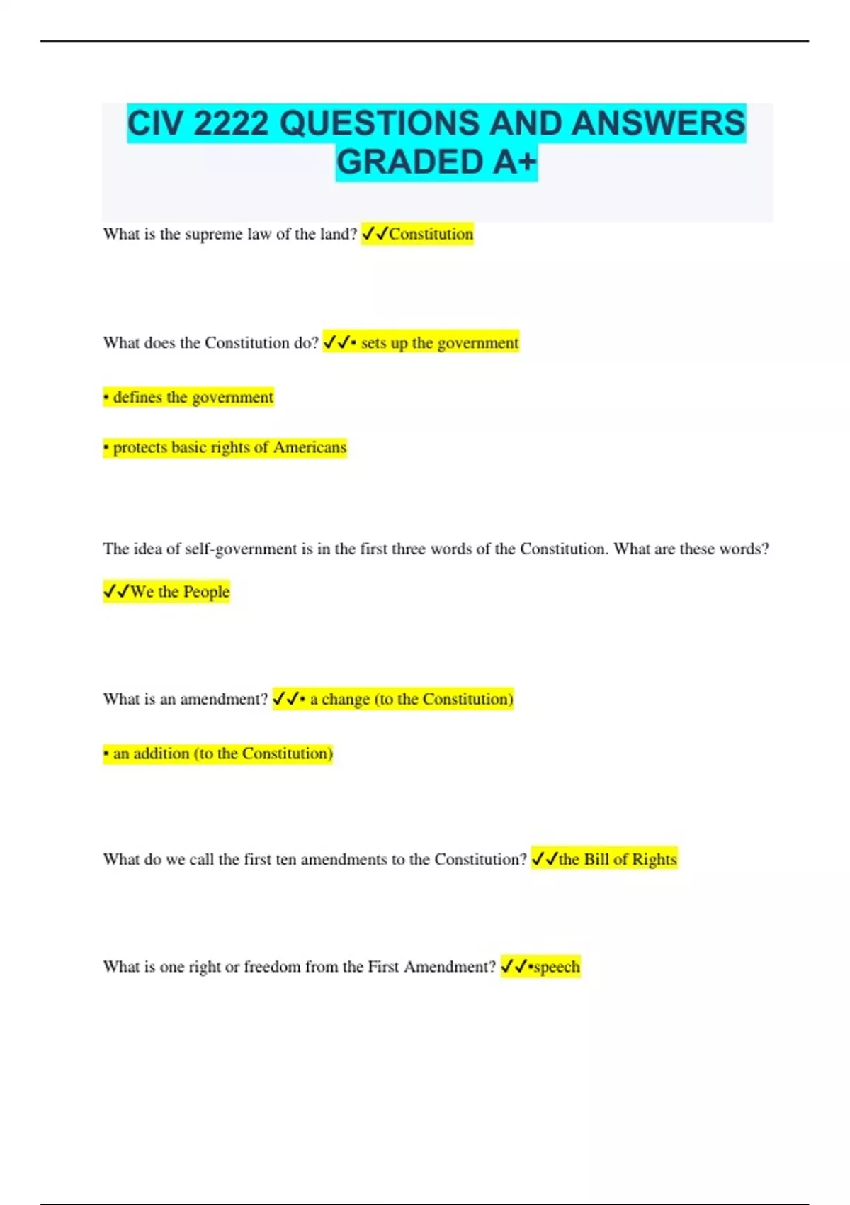 CIV 2222 QUESTIONS AND ANSWERS GRADED A+ What is the supreme law of the land? Constitution What does the Constitution do? ▪ sets up the government ▪ defines the government ▪ protects basic rights of Americans The idea of self-government is in the first three words of the Constitution. What are these words? We the People What is an amendment? ▪ a change (to the Constitution) ▪ an addition (to the Constitution) What do we call the first ten amendments to the Constitution? the Bill of Rights What is one right or freedom from the First Amendment? ▪speech ▪religion ▪assembly ▪press ▪petition the government How many amendments does the Constitution have? twenty-seven (27) What did the Declaration of Independence do? ▪announced our independence (from Great Britain) ▪declared our independence (from Great Britain) ▪said that the United States is free (from Great Britain) What are two rights in the Declaration of Independence? ▪life ▪liberty ▪pursuit of happiness What is freedom of religion? You can practice any religion, or not practice a religion. What is the economic system in the United States?* ▪ capitalist economy ▪ market economy What is the "rule of law"? ▪everyone must follow the law. ▪leaders must obey the law ▪government must obey the law ▪no one is above the law Name one branch or part of the government.* ▪ Congress ▪ legislative ▪ President ▪ executive ▪ the courts ▪ judicial What stops one branch of government from becoming too powerful? ▪ checks and balances ▪ separation of powers Who is in charge of the executive branch? ▪ the President Who makes federal laws? ▪ Congress ▪ Senate and House (of Representatives) ▪ (U.S. or national) legislature What are the two parts of the U.S. Congress?* ▪ the Senate and House (of Representatives) How many U.S. Senators are there? one hundred (100) We elect a U.S. Senator for how many years? 6 years Who is one of your state's U.S. Senators now?* rick scott or marco rubio The House of Representatives has how many voting m