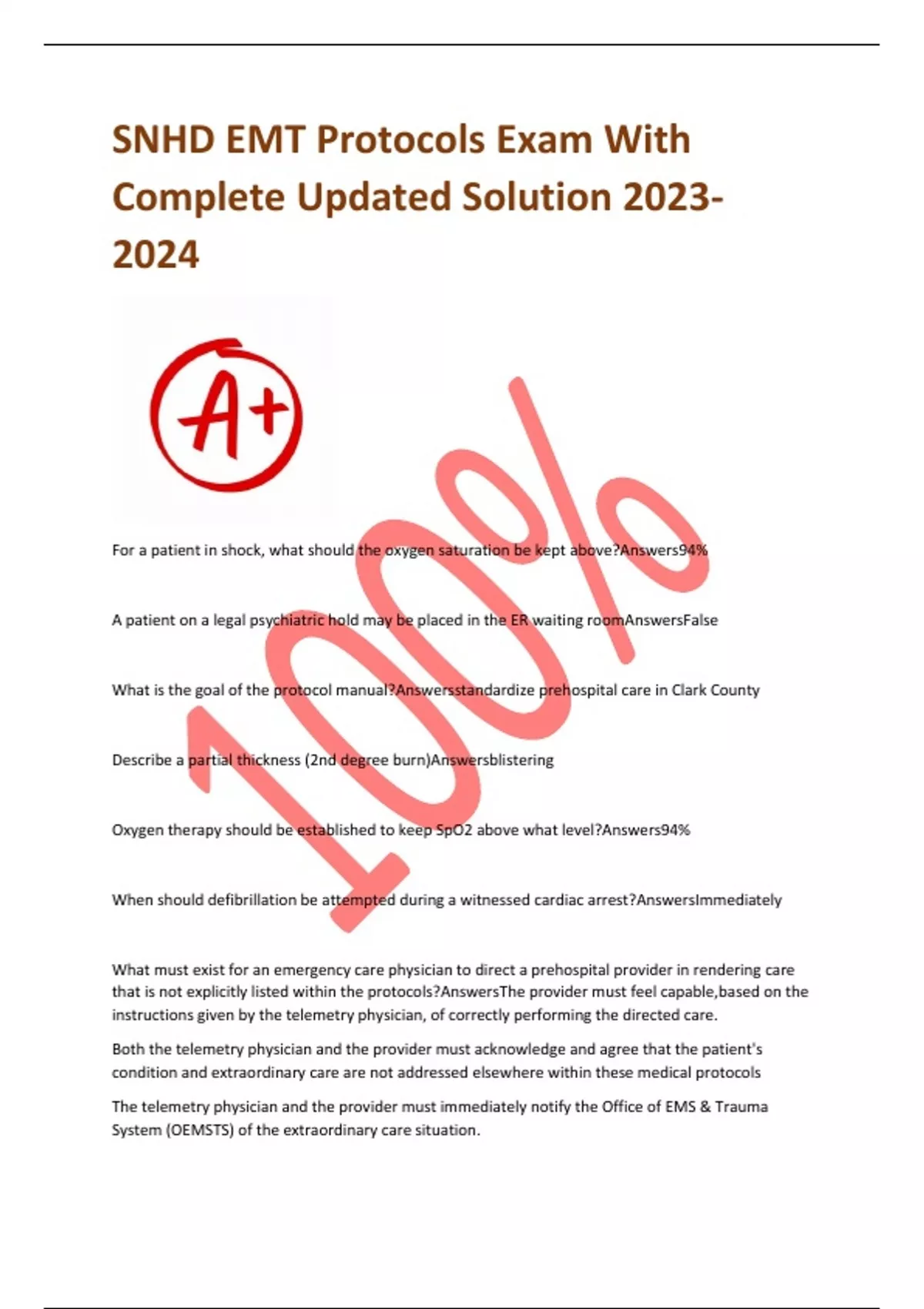 SNHD EMT Protocols Exam With Complete Updated Solution