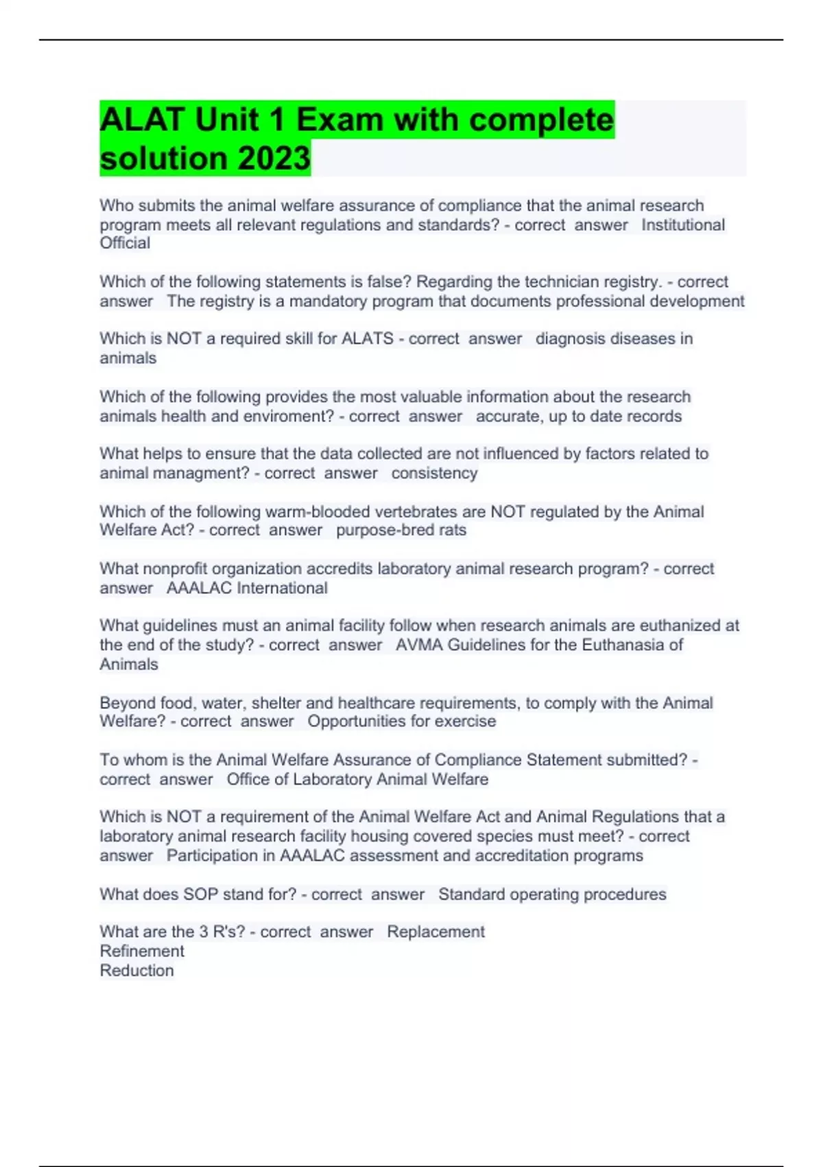 ALAT Unit 1 Exam with complete solution 2023/2024 Who submits the animal welfare assurance of compliance that the animal research program meets all relevant regulations and standards? - correct answer Institutional Official Which of the following statements is false? Regarding the technician registry. - correct answer The registry is a mandatory program that documents professional development Which is NOT a required skill for ALATS - correct answer diagnosis diseases in animals Which of the following provides the most valuable information about the research animals health and enviroment? - correct answer accurate, up to date records What helps to ensure that the data collected are not influenced by factors related to animal managment? - correct answer consistency Which of the following warm-blooded vertebrates are NOT regulated by the Animal Welfare Act? - correct answer purpose-bred rats What nonprofit organization accredits laboratory animal research program? - correct answer AAALAC International What guidelines must an animal facility follow when research animals are euthanized at the end of the study? - correct answer AVMA Guidelines for the Euthanasia of Animals Beyond food, water, shelter and healthcare requirements, to comply with the Animal Welfare? - correct answer Opportunities for exercise To whom is the Animal Welfare Assurance of Compliance Statement submitted? - correct answer Office of Laboratory Animal Welfare Which is NOT a requirement of the Animal Welfare Act and Animal Regulations that a laboratory animal research facility housing covered species must meet? - correct answer Participation in AAALAC assessment and accreditation programs What does SOP stand for? - correct answer Standard operating procedures What are the 3 R's? - correct answer Replacement Refinement Reduction