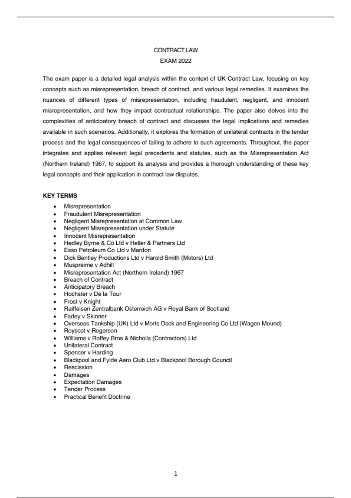 The exam paper is a detailed legal analysis within the context of UK Contract Law, focusing on key