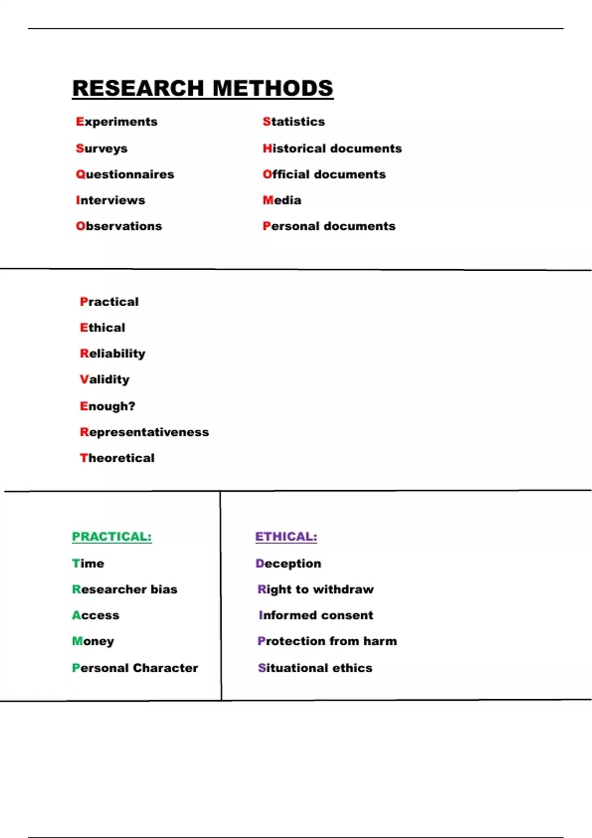 This is a research methods bank with acronyms which helped me memorise them in order to get an A*. They are colour coded based on practical, ethical and theoretical advantages and disadvantages.