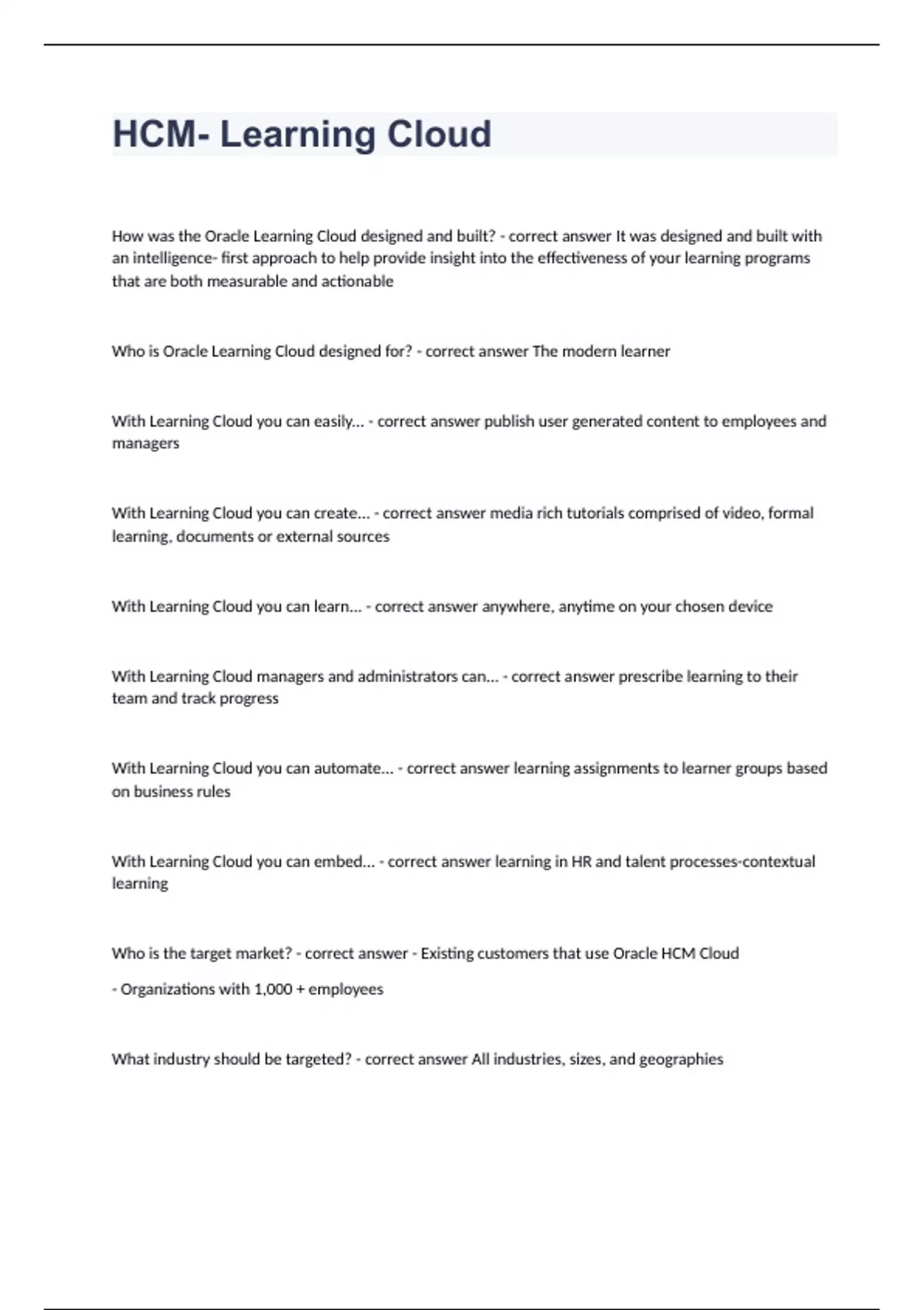 HCM- Learning Cloud Question and answers correctly solved 2023/2024 How was the Oracle Learning Cloud designed and built? - correct answer It was designed and built with an intelligence- first approach to help provide insight into the effectiveness of your learning programs that are both measurable and actionable Who is Oracle Learning Cloud designed for? - correct answer The modern learner With Learning Cloud you can easily... - correct answer publish user generated content to employees and managers With Learning Cloud you can create... - correct answer media rich tutorials comprised of video, formal learning, docum
