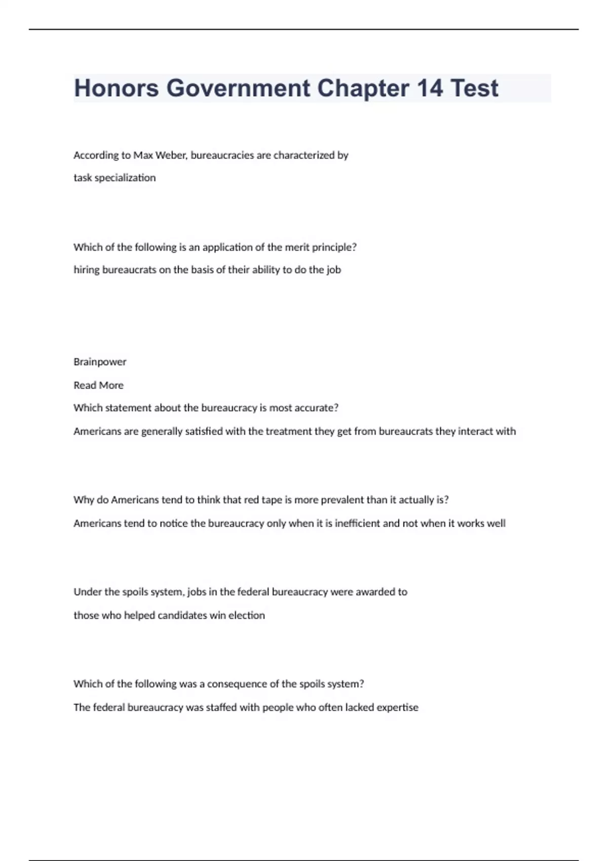 Honors Government Chapter 14 Test Question and answers correctly solved 2023/2024 According to Max Weber, bureaucracies are characterized by task specialization Which of the following is an application of the merit principle? hiring bureaucrats on the basis of their ability to do the job
