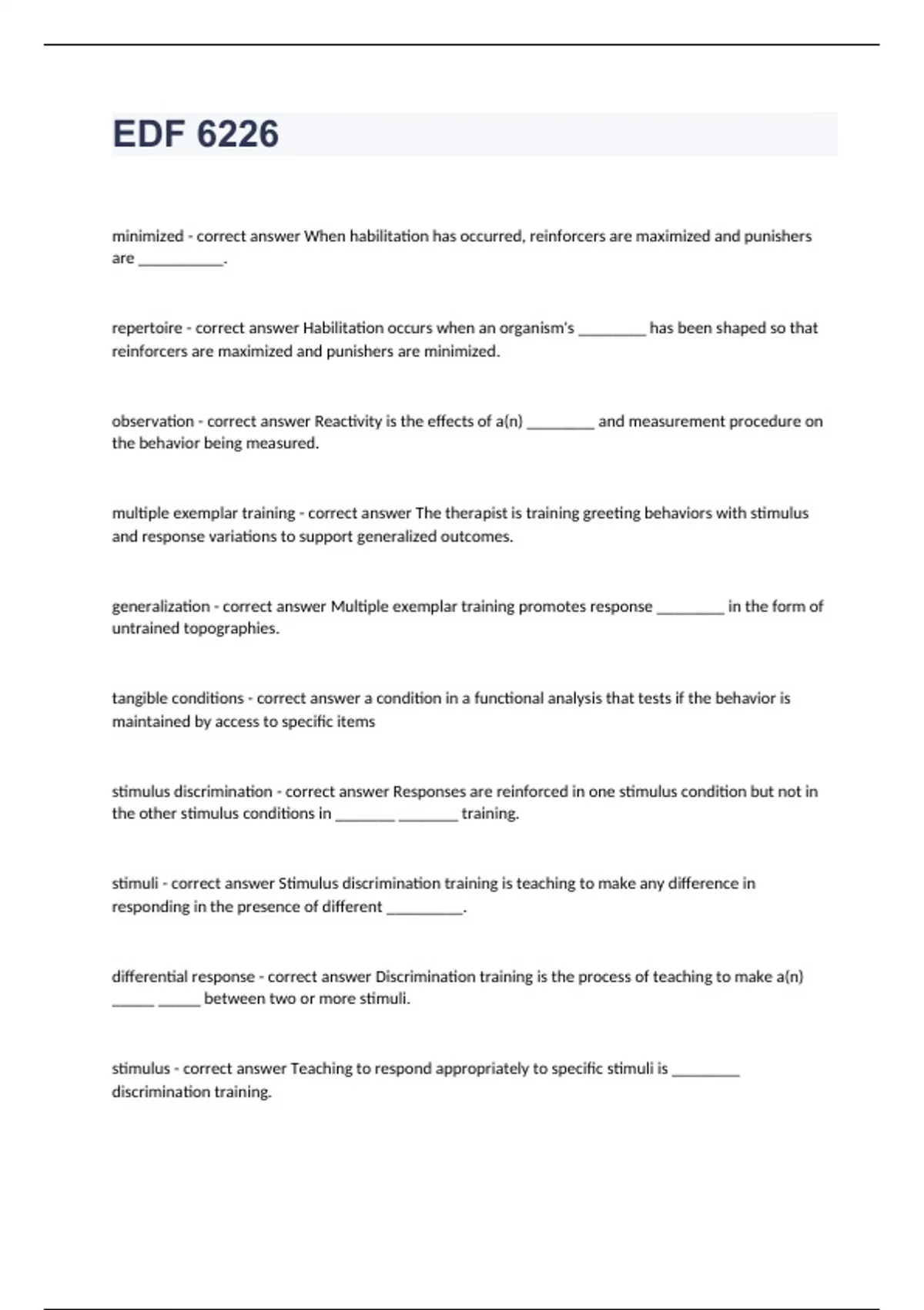 EDF 6226 minimized - correct answer When habilitation has occurred, reinforcers are maximized and punishers are __________. repertoire - correct answer Habilitation occurs when an organism's ________ has been shaped so that reinforcers are maximized and punishers are minimized. observation - correct answer Reactivity is the effects of a(n) ________ and measurement procedure on the behavior being measured. multiple exemplar training - correct answer The therapist is training greeting behaviors with stimulus and response variations to support generalized outcomes. generalization - correct answer Multiple exemplar training promotes response ________ in the form of untrained topographies. tangible conditions - correct answer a condition in a functional analysis that tests if the behavior is maintained by access to specific items stimulus discrimination - correct answer Responses are reinforced in one stimulus condition but not in the other stimulus conditions in _______ _______ training. stimuli - correct answer Stimulus discrimination training is teaching to make any difference in responding in the presence of different _________. differential response - correct answer Discrimination training is the process of teaching to make a(n) _____ _____ between two or more stimuli. stimulus - correct answer Teaching to respond appropriately to specific stimuli is ________ discrimination training. stimulus discrimination - correct answer The teacher is doing ________ _________ training with Mia, teaching her to tact "cow" in the presence of a cow but not a horse. untrained - correct answer In response generalization, _________ responses occur due to contingencies applied to other responses. response generalization - correct answer The extent a learner emits untrained responses that are functionally equivalent to the trained target behavior response maintenance - correct answer The extent to which a learner continues to perform the target behavior after a portion or all of the intervention is partially or completely terminated. target behavior - correct answer Response maintenance is the extent the learner continues to perform the _____ _____ after the intervention is terminated trained - correct answer In response generalization, untrained responses occur as a function of _______ contingencies response generalization - correct answer The therapist teaches Nia to mand for water and she spontaneously starts Manding for cheese. continues - correct answer Response maintenance is the extent the learner ________ to perform the target behavior after intervention termination response maintenance - correct answer The therapist measures _______ ________ by taking data on how often Nia bands after the intervention is removed. habilitation - correct answer Has been achieved when an organism's repertoire has been changed to maximize reinforcers and minimize punishers behavior - correct answer Reactivity is the effects of an observation and measurement procedure on the ______ being measured