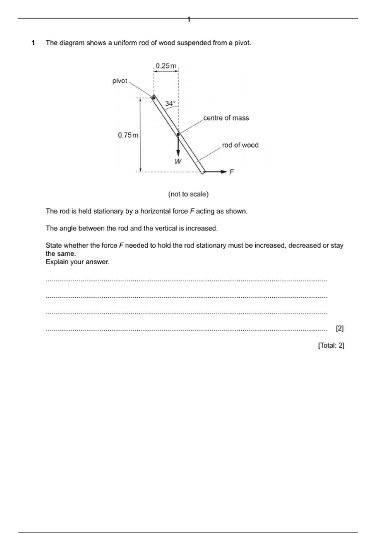 1 The diagram shows a uniform rod of wood suspended from a pivot.