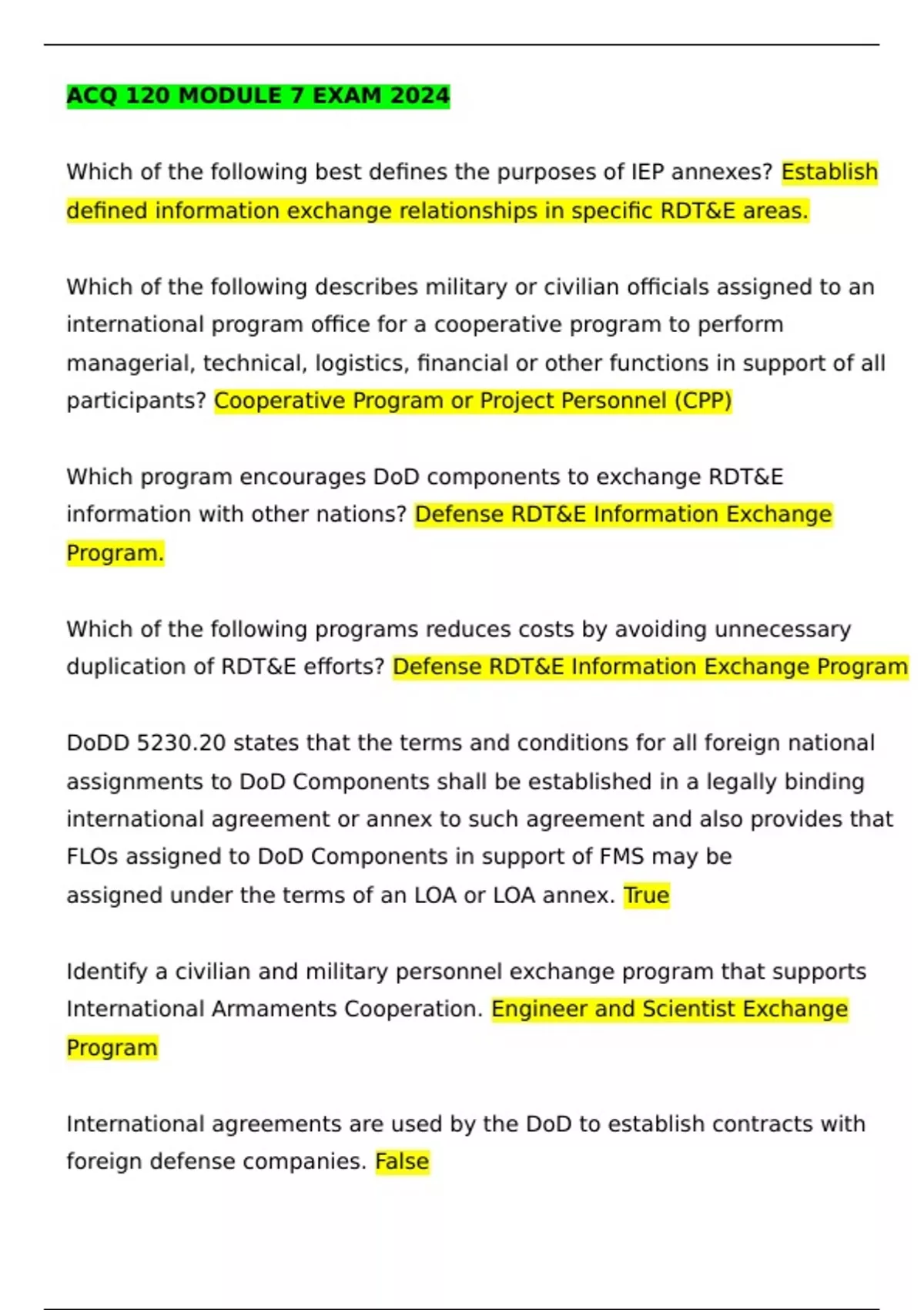 ACQ 120 MODULE 7 EXAM 2024 Which of the following best defines the purposes of IEP annexes? Establish defined information exchange relationships in specific RDT&E areas. Which of the following describes military or civilian officials assigned to an international program office for a cooperative program to perform managerial, technical, logistics, financial or other functions in support of all participants? Cooperative Program or Project Personnel (CPP) Which program encourages DoD components to exchange RDT&E information with other nations? Defense RDT&E Information Exchange Program. Which of the following programs reduces costs by avoiding unnecessary duplication of RDT&E efforts? Defense RDT&E Information Exchange Program