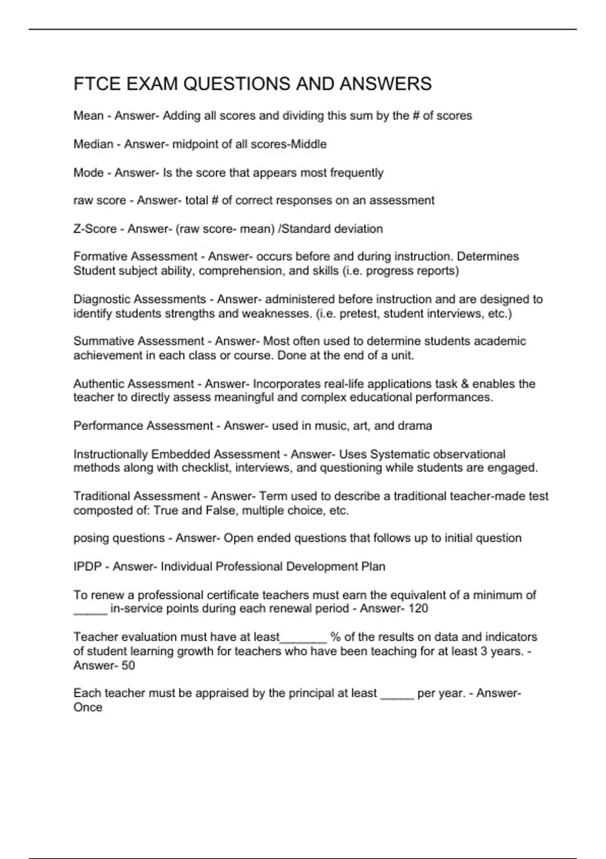 Mean - Answer- Adding all scores and dividing this sum by the # of scores Median - Answer- midpoint of all scores-Middle Mode - Answer- Is the score that appears most frequently raw score - Answer- total # of correct responses on an assessment Z-Score - Answer- (raw score- mean) /Standard deviation Formative Assessment - Answer- occurs before and during instruction. Determines Student subject ability, comprehension, and skills (i.e. progress reports) Diagnostic Assessments - Answer- administered before instruction and are designed to identify students strengths and weaknesses. (i.e. pretest, student interviews, etc.) Summative Assessment - Answer- Most often used to determine students academic achievement in each class or course. Done at the end of a unit. Authentic Assessment - Answer- Incorporates real-life applications task & enables the teacher to directly assess meaningful and complex educational performances. Performance Assessment - Answer- used in music, art, and drama Instructionally Embedded Assessment - Answer- Uses Systematic observational methods along with checklist, interviews, and questioning while students are engaged. Traditional Assessment - Answer- Term used to describe a traditional teacher-made test composted of: True and False, multiple choice, etc. posing questions - Answer- Open ended questions that follows up to initial question IPDP - Answer- Individual Professional Development Plan