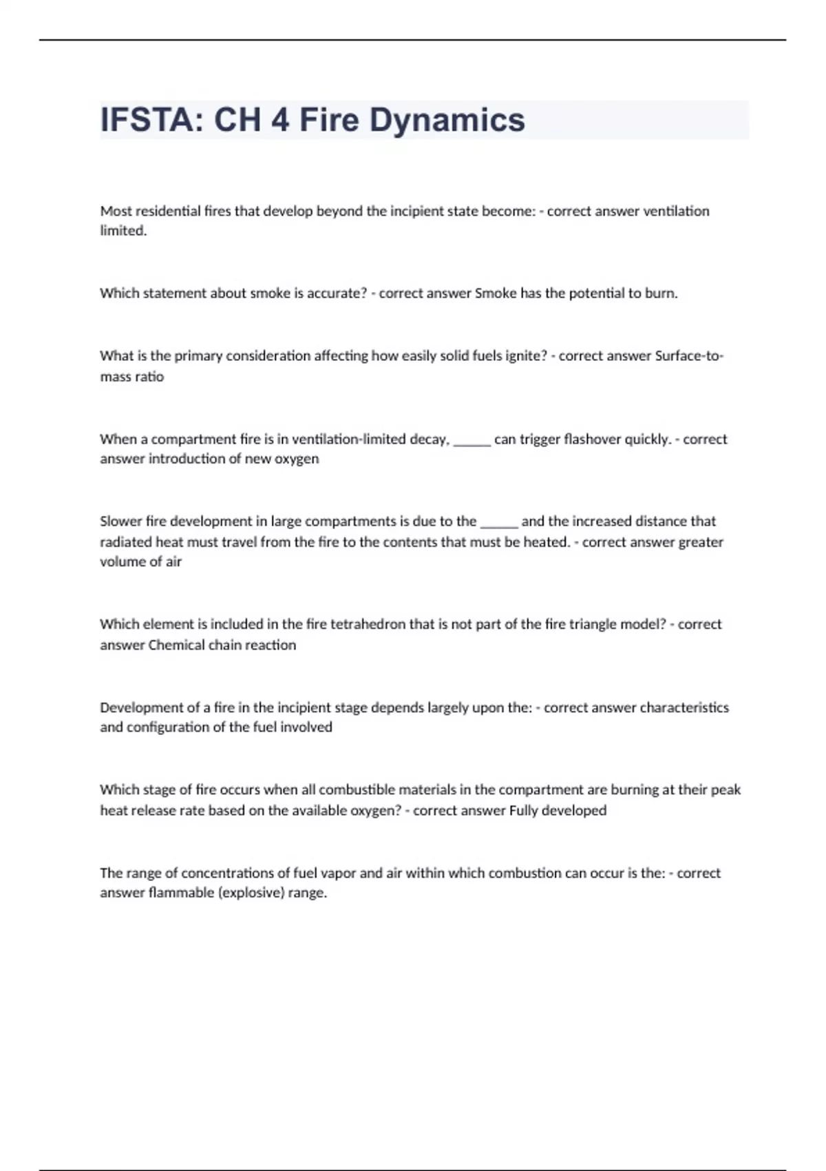 IFSTA: CH 4 Fire Dynamics Most residential fires that develop beyond the incipient state become: - correct answer ventilation limited. Which statement about smoke is accurate? - correct answer Smoke has the potential to burn. What is the primary consideration affecting how easily solid fuels ignite? - correct answer Surface-to-mass ratio When a compartment fire is in ventilation-limited decay, _____ can trigger flashover quickly. - correct answer introduction of new oxygen Slower fire development in large compartments is due to the _____ and the increased distance that radiated heat must travel from the fire to the contents that must be heated. - correct answer greater volume of air Which element is included in the fire tetrahedron that is not part of the fire triangle model? - correct answer Chemical chain reaction Development of a fire in the incipient stage depends largely upon the: - correct answer characteristics and configuration of the fuel involved Which stage of fire occurs when all combustible materials in the compartment are burning at their peak heat release rate based on the available oxygen? - correct answer Fully developed The range of concentrations of fuel vapor and air within which combustion can occur is the: - correct answer flammable (explosive) range.