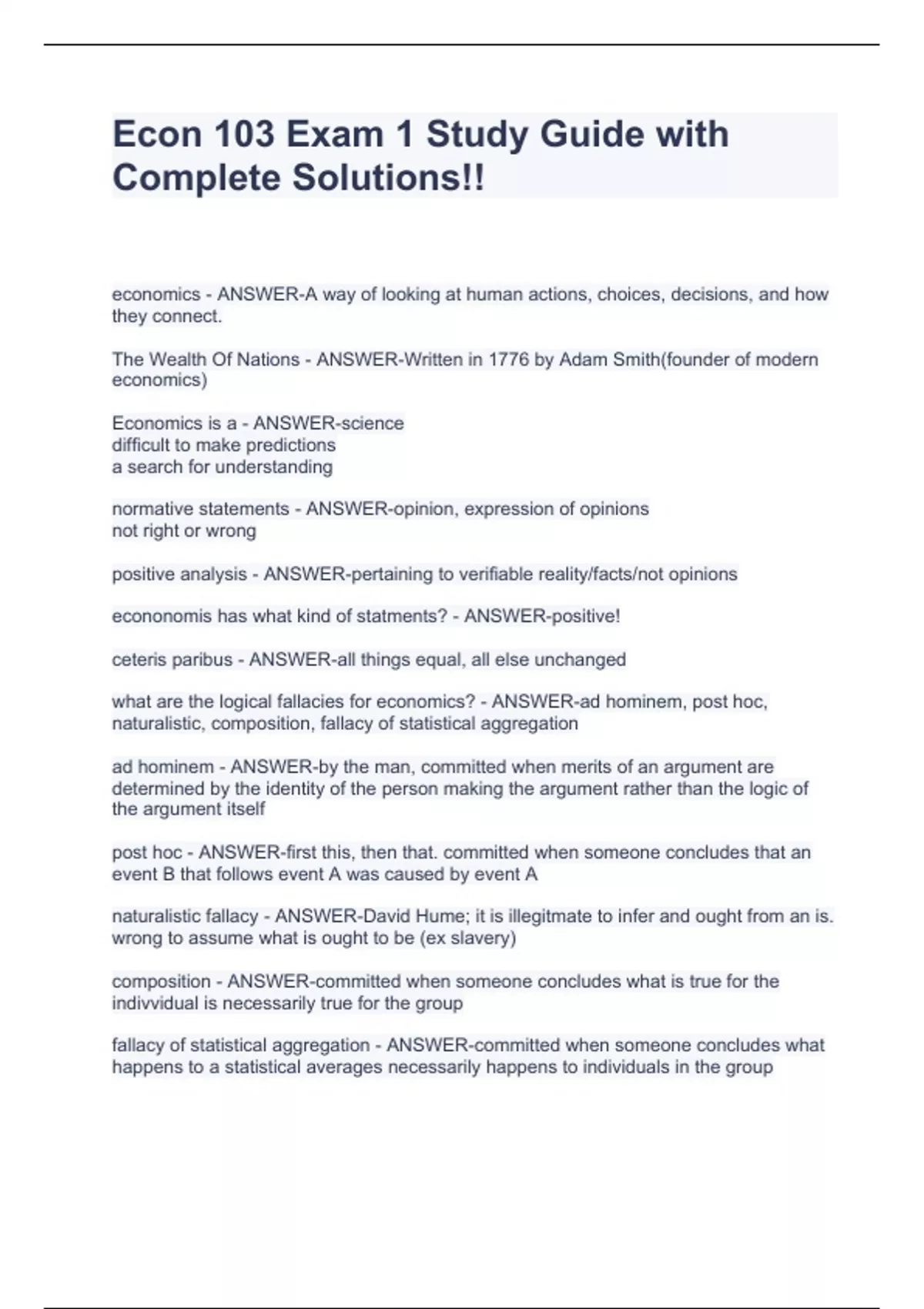 Econ 103 Exam 1 Study Guide with Complete Solutioeconomics - ANSWER-A way of looking at human actions, choices, decisions, and how they connect. The Wealth Of Nations - ANSWER-Written in 1776 by Adam Smith(founder of modern economics) Economics is a - ANSWER-science difficult to make predictions a search for understanding normative statements - ANSWER-opinion, expression of opinions not right or wrong positive analysis - ANSWER-pertaining to verifiable reality/facts/not opinions econonomis has what kind of statments? - ANSWER-positive! ceteris paribus - ANSWER-all things equal, all else unchanged what are the logical fallacies for economics? - ANSWER-ad hominem, post hoc, naturalistic, composition, fallacy of statistical aggregation ad hominem - ANSWER-by the man, committed when merits of an argument are determined by the identity of the person making the argument rather than the logic of the argument itself post hoc - ANSWER-first this, then that. committed when someone concludes that an event B that follows event A was caused by event A naturalistic fallacy - ANSWER-David Hume; it is illegitmate to infer and ought from an is. wrong to assume what is ought to be (ex slavery) composition - ANSWER-committed when someone concludes what is true for the indivvidual is necessarily true for the group fallacy of statistical aggregation - ANSWER-committed when someone concludes what happens to a statistical averages necessarily happens to individuals in the group ns!!