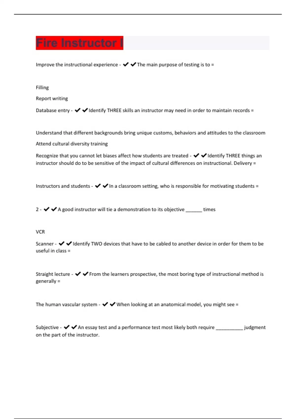 Improve the instructional experience - The main purpose of testing is to = Filling Report writing Database entry - Identify THREE skills an instructor may need in order to maintain records = Understand that different backgrounds bring unique customs, behaviors and attitudes to the classroom Attend cultural diversity training Recognize that you cannot let biases affect how students are treated - Identify THREE things an instructor should do to be sensitive of the impact of cultural differences on instructional. Delivery = Instructors and students - In a classroom setting, who is responsible for motivating students = 2 - A good instructor will tie a demonstration to its objective ______ times VCR Scanner - Identify TWO devices that have to be cabled to another device in order for them to be useful in class = Straight lecture - From the learners prospective, the most boring type of instructional method is generally = The human vascular system - When looking at an anatomical model, you might see = Subjective - An essay test and a performance test most likely both require __________ judgment on the part of the instructor.An essay question - The type of question that would best test a fire chiefs ability to defend a field decisions is = Competency - "Pass / Fail " is another name for _______ testing. Set an example by following school safety procedure Set a zero tolerance policy for learners breaking school or procedural safety rules Follow all safety procedures during demonstrations - Identify THREE practical ways fir the instructor to encourage safety in the classroom = Criterion referenced testing - The type of test traditionally used in fire protection training is = Slide projector - The type of media that CANNOT be used to display videotape is the = To play background noises and relevant radio and scanner information - The best reason to have audio at a tabletop demonstration is = Display board - The best type of simulator to demonstrate a vehicles air braking system would be = NFPA 1401 - To locate a sample of a firefighter training record format, you would look in = A diverger - If a learner wants to find out why the class material is being taught, he is most likely Demonstration - Skills-based instruction is best taught via = 1. Assemble course materials 2. Review course materials 3. Evaluate. Resources4. Review policies and procedures - Place the steps for evaluating a course in the correct order =