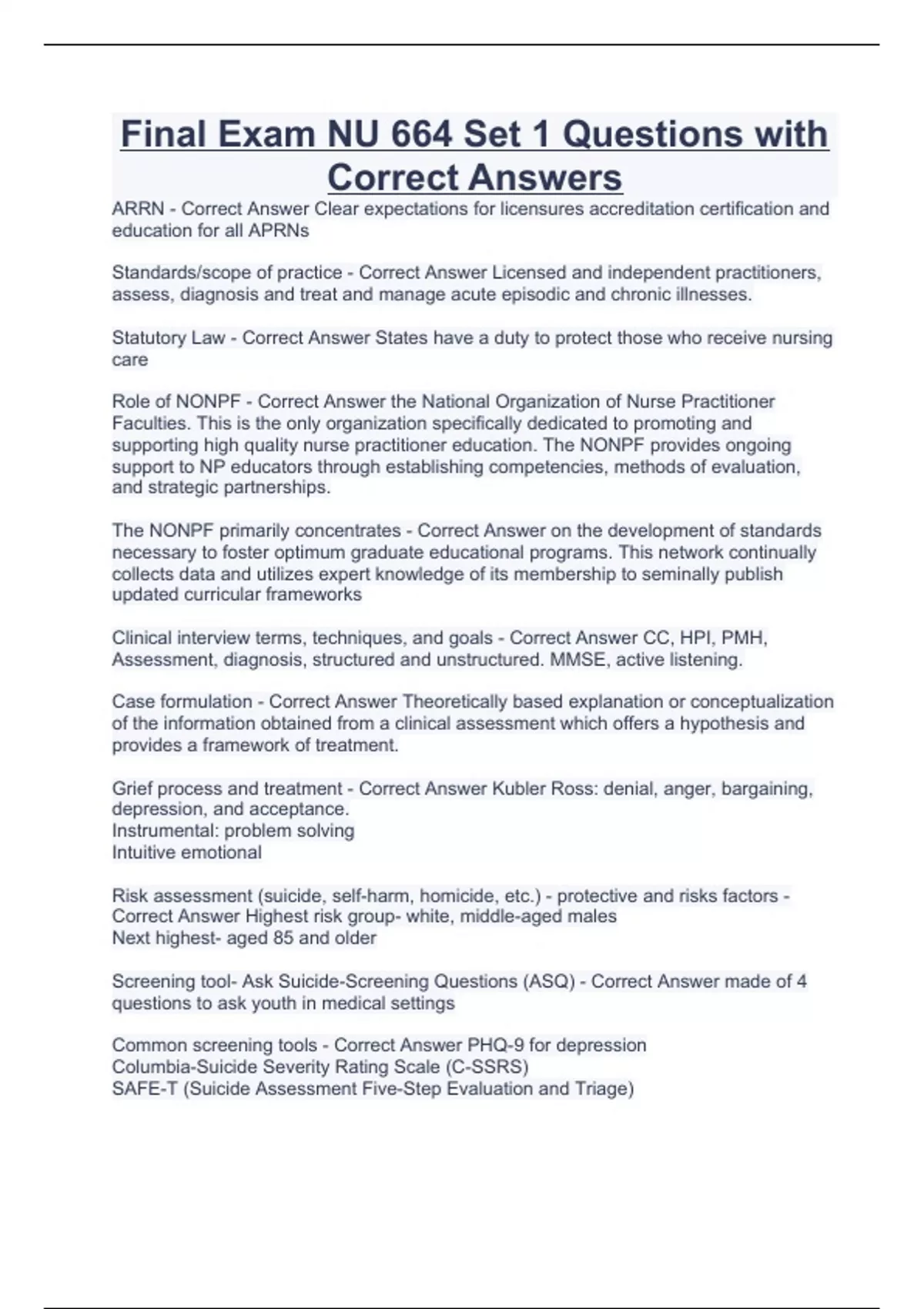 Final Exam NU 664 Set 1 Questions with Correct Answers ARRN - Correct Answer Clear expectations for licensures accreditation certification and education for all APRNs Standards/scope of practice - Correct Answer Licensed and independent practitioners, assess, diagnosis and treat and manage acute episodic and chronic illnesses. Statutory Law - Correct Answer States have a duty to protect those who receive nursing care Role of NONPF - Correct Answer the National Organization of Nurse Practitioner Faculties. This is the only organization specifically dedicated to promoting and supporting high quality nurse practitioner education. The NONPF provides ongoing support to NP educators through establishing competencies, methods of evaluation, and strategic partnerships. The NONPF primarily concentrates - Correct Answer on the development of standards necessary to foster optimum graduate educational programs. This network continually collects data and utilizes expert knowledge of its membership to seminally publish updated curricular frameworks Clinical interview terms, techniques, and goals - Correct Answer CC, HPI, PMH, Assessment, diagnosis, structured and unstructured. MMSE, active listening. Case formulation - Correct Answer Theoretically based explanation or conceptualization of the information obtained from a clinical assessment which offers a hypothesis and provides a framework of treatment. Grief process and treatment - Correct Answer Kubler Ross: denial, anger, bargaining, depression, and acceptance. Instrumental: problem solving Intuitive emotional Risk assessment (suicide, self-harm, homicide, etc.) - protective and risks factors - Correct Answer Highest risk group- white, middle-aged males Next highest- aged 85 and older Screening tool- Ask Suicide-Screening Questions (ASQ) - Correct Answer made of 4 questions to ask youth in medical settings Common screening tools - Correct Answer PHQ-9 for depression Columbia-Suicide Severity Rating Scale (C-SSRS) SAFE-T (Suicide Assessment Five-Step Evaluation and Triage)