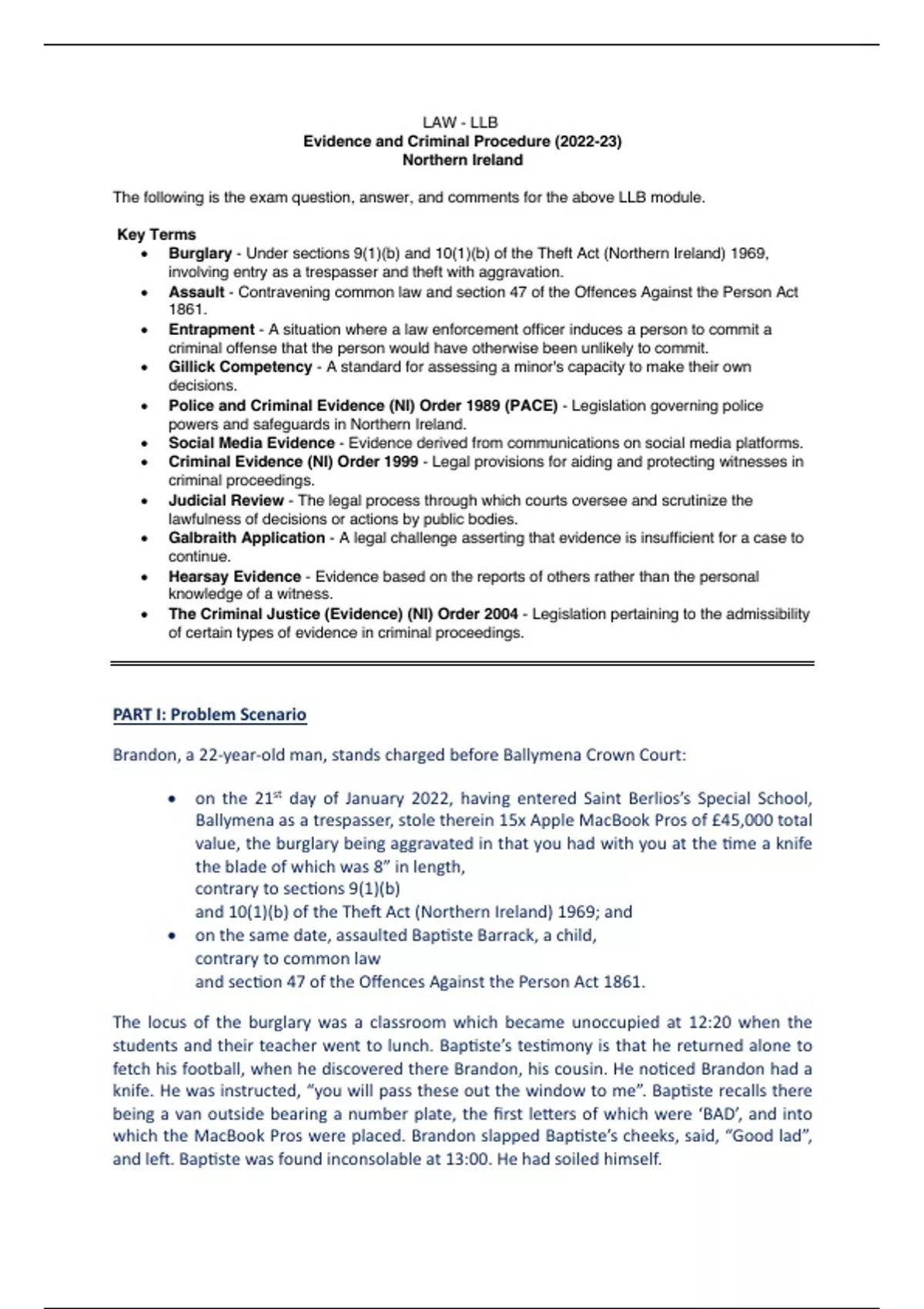 Past exam paper on Evidence and Criminal Procedure in Northern Ireland.