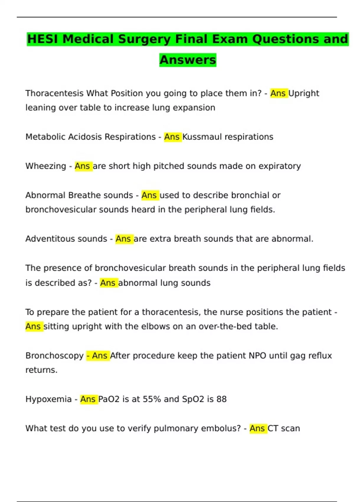 HESI Medical Surgery Final Exam Questions and Answers Thoracentesis What Position you going to place them in? - Ans Upright leaning over table to increase lung expansion Metabolic Acidosis Respirations - Ans Kussmaul respirations Wheezing - Ans are short high pitched sounds made on expiratory Abnormal Breathe sounds - Ans used to describe bronchial or bronchovesicular sounds heard in the peripheral lung fields. Adventitous sounds - Ans are extra breath sounds that are abnormal. The presence of bronchovesicular breath sounds in the peripheral lung fields is described as? - Ans abnormal lung sounds To prepare the patient for a thoracentesis, the nurse positions the patient - Ans sitting upright with the elbows on an over-the-bed table. Bronchoscopy - Ans After procedure keep the patient NPO until gag reflux returns. Hypoxemia - Ans PaO2 is at 55% and SpO2 is 88 What test do you use to verify pulmonary embolus? - Ans CT scan A patient with an SaO2 of 85% has a PaO2 of 50mm Hg. This indicates? - Ans shift to the left in the oxygen-hemoglobin dissociation curve that could be caused by hypothermia. Normal Arterial Blood Gases - Ans pH 7.35-7.45, PaO2 80-100mm Hg, SaO2 >95%, PaCO2 32-48 mm Hg, HCO3- 22-26 mEq/L