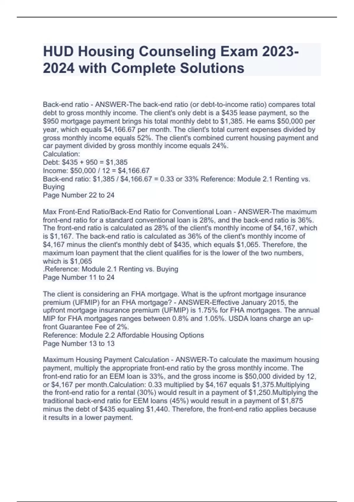 HUD Housing Counseling Exam with Complete SolutionsHUD Housing Counseling Exam with Complete SolutionsHUD Housing Counseling Exam with Complete Solutions Back-end ratio - ANSWER-The back-end ratio (or debt-to-income ratio) compares total debt to gross monthly income. The client's only debt is a $435 lease payment, so the $950 mortgage payment brings his total monthly debt to $1,385. He earns $50,000 per year, which equals $4,166.67 per month. The client's total current expenses divided by gross monthly income equals 52%. The client's combined current housing payment and car payment divided by gross monthly income equals 24%. Calculation: Debt: $435 + 950 = $1,385 Income: $50,000 / 12 = $4,166.67 Back-end ratio: $1,385 / $4,166.67 = 0.33 or 33% Reference: Module 2.1 Renting vs. Buying Page Number 22 to 24 Max Front-End Ratio/Back-End Ratio for Conventional Loan - ANSWER-The maximum front-end ratio for a standard conventional loan is 28%, and the back-end ratio is 36%. The front-end ratio is calculated as 28% of the client's monthly income of $4,167, which