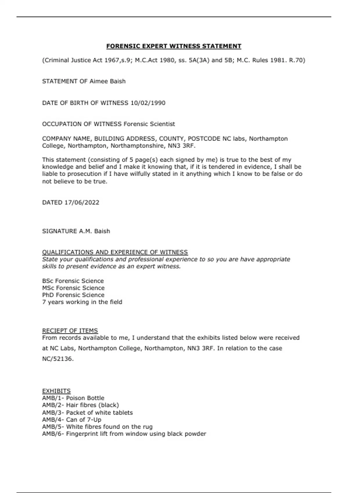 FORENSIC EXPERT WITNESS STATEMENT