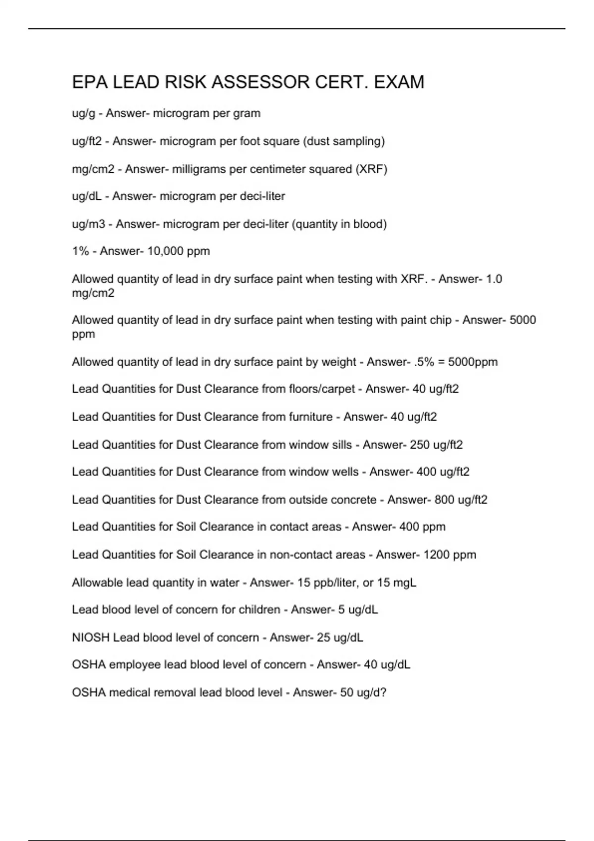 ug/g - Answer- microgram per gram ug/ft2 - Answer- microgram per foot square (dust sampling) mg/cm2 - Answer- milligrams per centimeter squared (XRF) ug/dL - Answer- microgram per deci-liter ug/m3 - Answer- microgram per deci-liter (quantity in blood) 1% - Answer- 10,000 ppm Allowed quantity of lead in dry surface paint when testing with XRF. - Answer- 1.0 mg/cm2 Allowed quantity of lead in dry surface paint when testing with paint chip - Answer- 5000 ppm Allowed quantity of lead in dry surface paint by weight - Answer- .5% = 5000ppm Lead Quantities for Dust Clearance from floors/carpet - Answer- 40 ug/ft2 Lead Quantities for Dust Clearance from furniture - Answer- 40 ug/ft2 Lead Quantities for Dust Clearance from window sills - Answer- 250 ug/ft2 Lead Quantities for Dust Clearance from window wells - Answer- 400 ug/ft2 Lead Quantities for Dust Clearance from outside concrete - Answer- 800 ug/ft2 Lead Quantities for Soil Clearance in contact areas - Answer- 400 ppm Lead Quantities for Soil Clearance in non-contact areas - Answer- 1200 ppm Allowable lead quantity in water - Answer- 15 ppb/liter, or 15 mgL Lead blood level of concern for children - Answer- 5 ug/dL NIOSH Lead blood level of concern - Answer- 25 ug/dL OSHA employee lead blood level of concern - Answer- 40 ug/dL OSHA medical removal lead blood level - Answer- 50 ug/d?