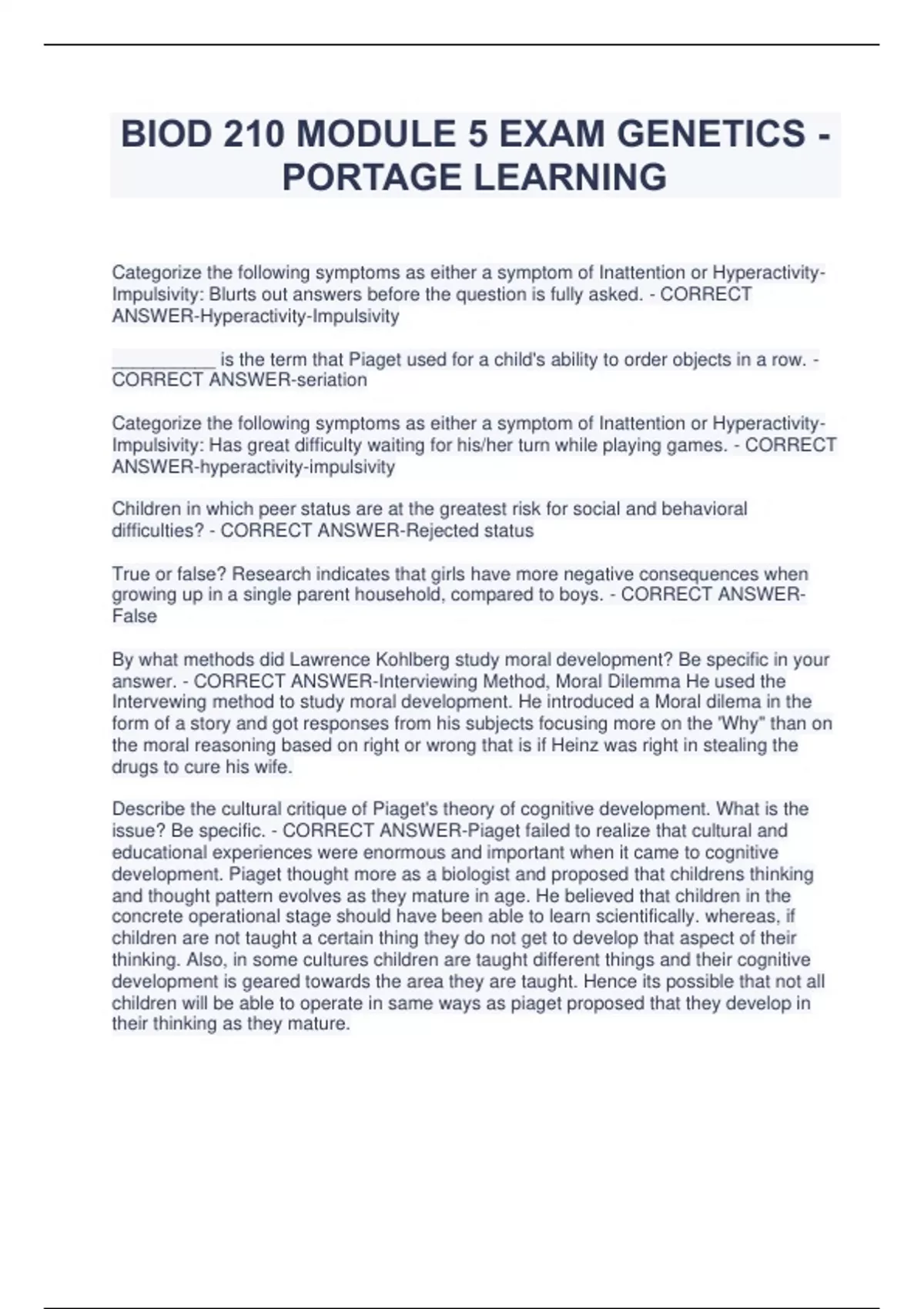 BIOD 210 MODULE 5 EXAM GENETICS - PORTAGE LEARNING Categorize the following symptoms as either a symptom of Inattention or HyperactivityImpulsivity: Blurts out answers before the question is fully asked. - CORRECT ANSWER-Hyperactivity-Impulsivity __________ is the term that Piaget used for a child's ability to order objects in a row. - CORRECT ANSWER-seriation Categorize the following symptoms as either a symptom of Inattention or HyperactivityImpulsivity: Has great difficulty waiting for his/her turn while playing games. - CORRECT ANSWER-hyperactivity-impulsivity Children in which peer status are at the greatest risk for social and behavioral difficulties? - CORRECT ANSWER-Rejected status True or false? Research indicates that girls have more negative consequences when growing up in a single parent household, compared to boys. - CORRECT ANSWERFalse By what methods did Lawrence Kohlberg study moral development? Be specific in your answer. - CORRECT ANSWER-Interviewing Method, Moral Dilemma He used the Intervewing method to study moral development. He introduced a Moral dilema in the form of a story and got responses from his subjects focusing more on the 'Why" than on the moral reasoning based on right or wrong that is if Heinz was right in stealing the drugs to cure his wife. Describe the cultural critique of Piaget's theory of cognitive development. What is the issue? Be specific. - CORRECT ANSWER-Piaget failed to realize that cultural and educational experiences were enormous and important when it came to cognitive development. Piaget thought more as a biologist and proposed that childrens thinking and thought pattern evolves as they mature in age. He believed that children in the concrete operational stage should have been able to learn scientifically. whereas, if children are not taught a certain thing they do not get to develop that aspect of their thinking. Also, in some cultures children are taught different things and their cognitive development is geared towards the area they are taught. Hence its possible that not all children will be able to operate in same ways as piaget proposed that they develop in their thinking as they mature. True or false? In early childhood and the beginning of middle childhood, boys tend to show more advances in fine motor skills compared to girls. - CORRECT ANSWERFalse Describe the following two social categories of children: Prosocial popular children and Antisocial popular children. - CORRECT ANSWER-Prosocial Popular Children: These are childen who are liked by their peers. They get high positive votes and they have really good social skills. They are good listeners, get along with their peers and they d