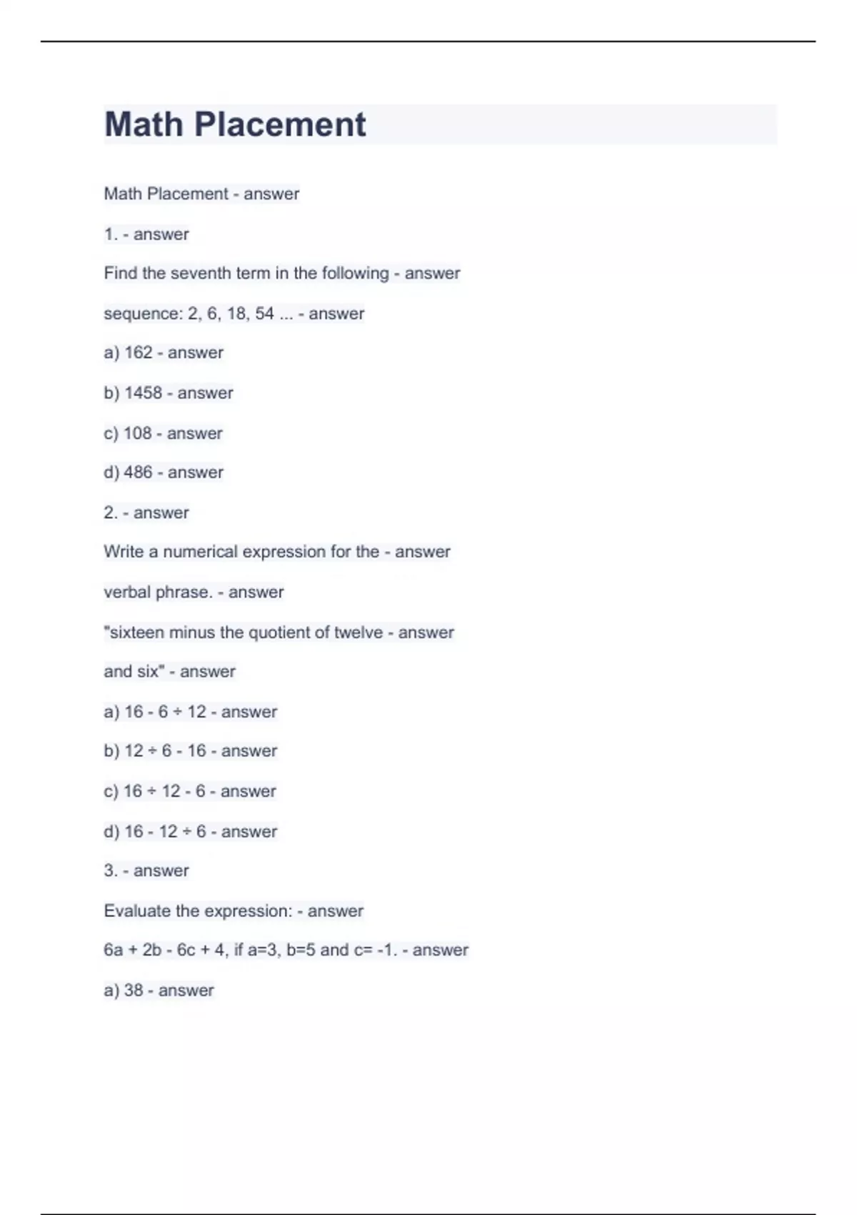 Math Placement test 3.Assignment having exams and solutions