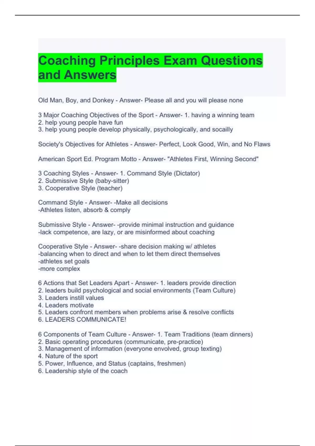Coaching Principles Exam Questions and Answers