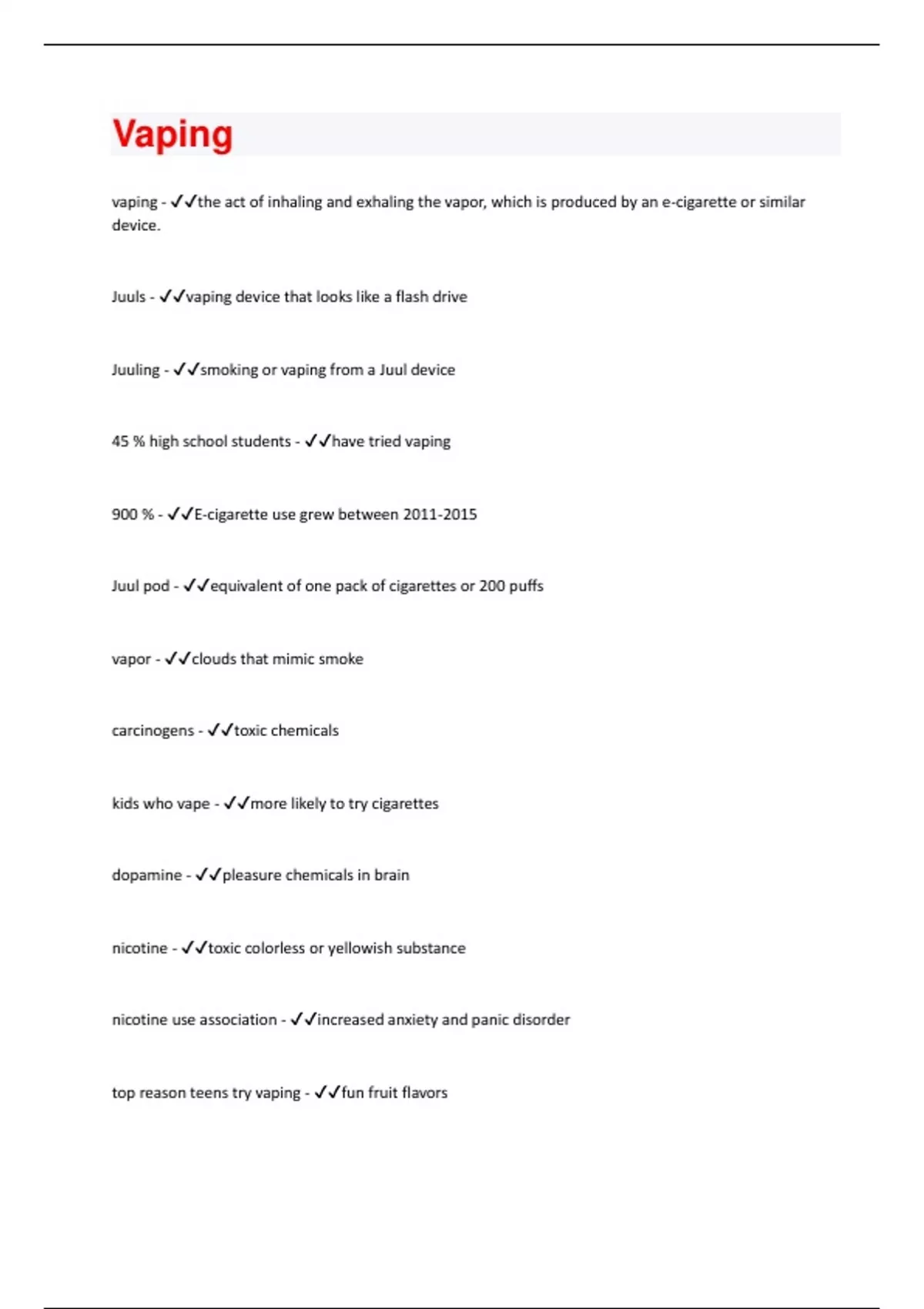 vaping - the act of inhaling and exhaling the vapor, which is produced by an e-cigarette or similar device. Juuls - vaping device that looks like a flash drive Juuling - smoking or vaping from a Juul device 45 % high school students - have tried vaping 900 % - E-cigarette use grew between Juul pod - equivalent of one pack of cigarettes or 200 puffs vapor - clouds that mimic smoke carcinogens - toxic chemicals kids who vape - more likely to try cigarettes dopamine - pleasure chemicals in brain nicotine - toxic colorless or yellowish substance nicotine use association - increased anxiety and panic disorder top reason teens try vaping - fun fruit flavorsproblem with e-cigarettes - no government regulation creative ways to say no - That stuff makes me sick, I can't stay, I've got to help my mom with something explain the danger to friends - Don't you know how bad that stuff is?; Haven't you heard about the kid in the news that died from that?