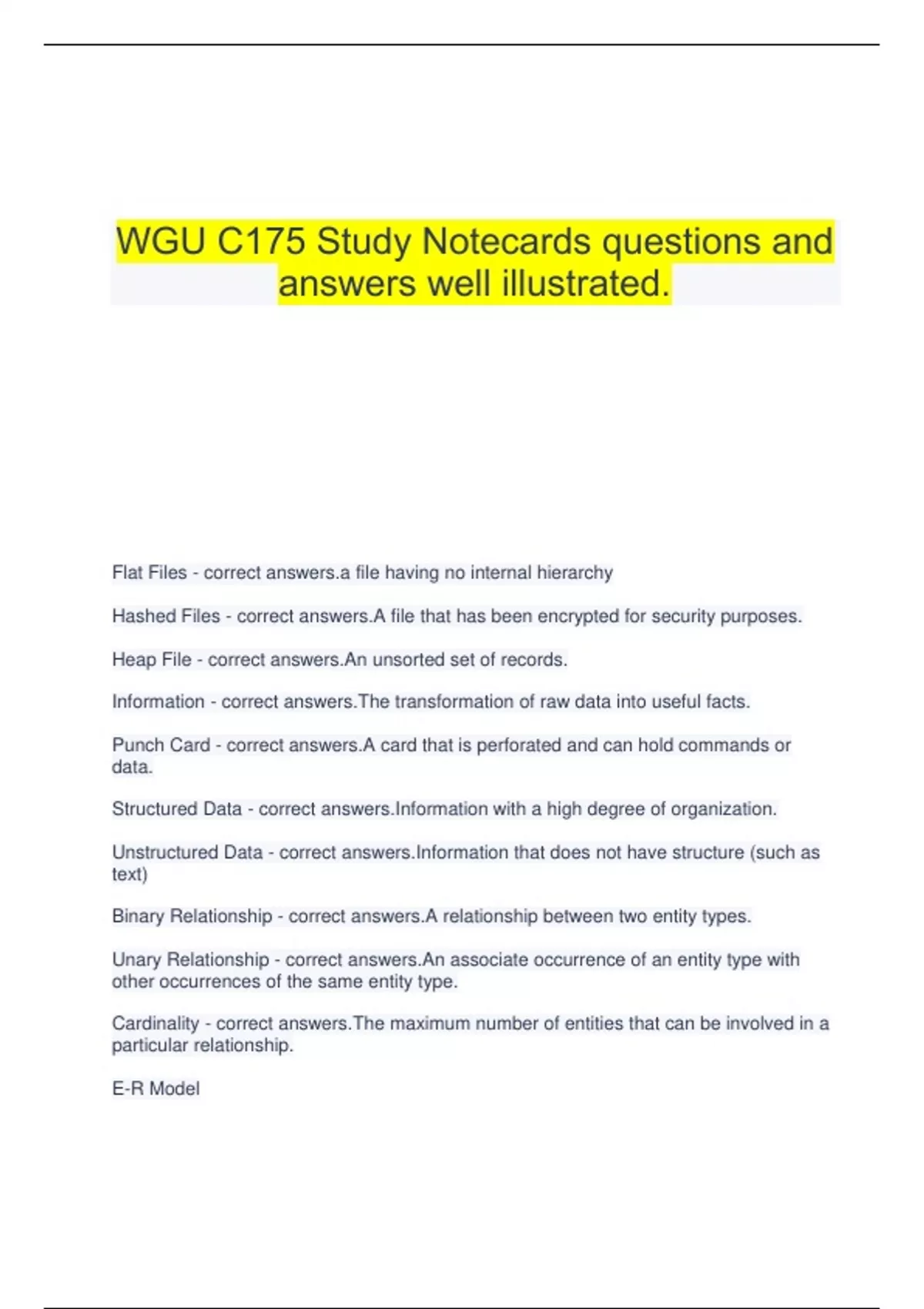 WGU C175 Study Notecards questions and answers well illustrated. Flat Files - correct answers.a file having no internal hierarchy Hashed Files - correct answers.A file that has been encrypted for security purposes. Heap File - correct answers.An unsorted set of records. Information - correct answers.The transformation of raw data into useful facts. Punch Card - correct answers.A card that is perforated and can hold commands or data. Structured Data - correct answers.Information with a high degree of organization. Unstructured Data - correct answers.Information that does not have structure (such as text) Binary Relationship - correct answers.A relationship between two entity types. Unary Relationship - correct answers.An associate occurrence of an entity type with other occurrences of the same entity type. Cardinality - correct answers.The maximum number of entities that can be involved in a particular relationship. E-R Model *E-R = Entity - Relationship - correct answers.Diagram of entities together with their attributes and the relationship among them. Intersection Data - correct answers.It is data that describes a many-to-many relationship. Modality - correct answers.It is a minimum number of entity occurrences that can be involved in a relationship. One-to-one Binary Relationship - correct answers.It means that a single occurrence of one entity type can be associated with a single occurrence of the other entity type and vice versa. Ternary Relationship - correct answers.Involves three different entity types. Unique identifier - correct answers.It is used to uniquely identify each record in a database table. Attribute - correct answers.A property, characteristic, or fact that we know about an entity. "A salesperson works in one office." What is the name of this relationship? - correct answers.One-to-one binary relationship "A salesperson sells to many customers." What is the name of this relationship? - correct answers.One-to-many binary relationship "A salesperson is authorized to sell many products, and a product can be sold by many salespersons." What is the name of this relationship? - correct answers.Many-to-many binary relationship What is the positioning and meaning for Cardinality and Modality on an E-R model? - correct answers.Cardinality is the outer symbol; represents the maximum. Modality is the inner symbol; represents the minimum. "A salesperson works in a minimum of one and a maximum of one office, and an office may be occupied by or assigned to a minimum of zero and a maximum of one salesperson." - correct answers.