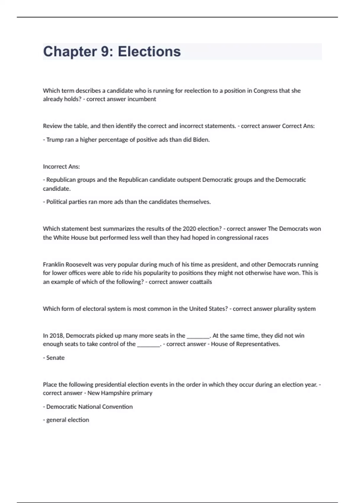 Chapter 9 Elections Question and answers rated A+ 2023/2024 Which term describes a candidate who is running for reelection to a position in Congress that she already holds? - correct answer incumbent Review the table, and then identify the correct and incorrect statements. - correct answer Correct Ans: - Trump ran a higher percentage of positive ads than did Biden. Incorrect Ans: - Republican groups and the Republican candidate outspent Democratic groups and the Democratic candidate. - Political parties ran more ads than the candidates themselves.