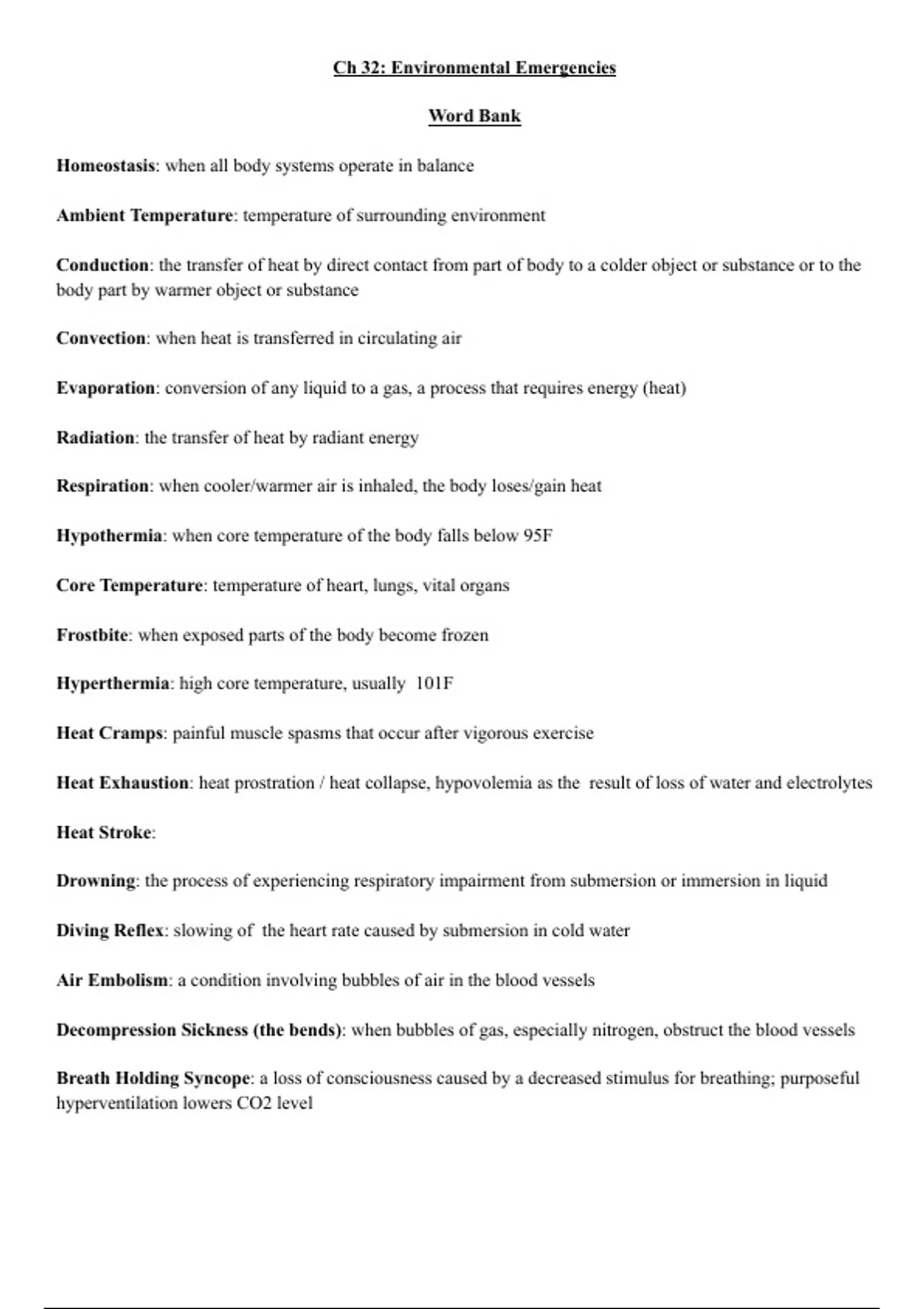 Summary of Chapter 32: Environmental Emergencies from Emergency Care and Transportation of the Sick and Injured Includes: Cold exposure: hypothermia, frostbite, immersion foot Heat exposure: heat cramps, heat exhaustion, heat stroke Drowning & Diving: air embolus, decompression sickness Altitude & Lightning: High Altitude Pulmonary Edema, High Altitude Cerebral Edema, direct strike, indirect strike, burns Bites, Envenomations, & Marine Animals: spider bites, Hymenoptera stings, snake bites, scorpion stings, tick bites