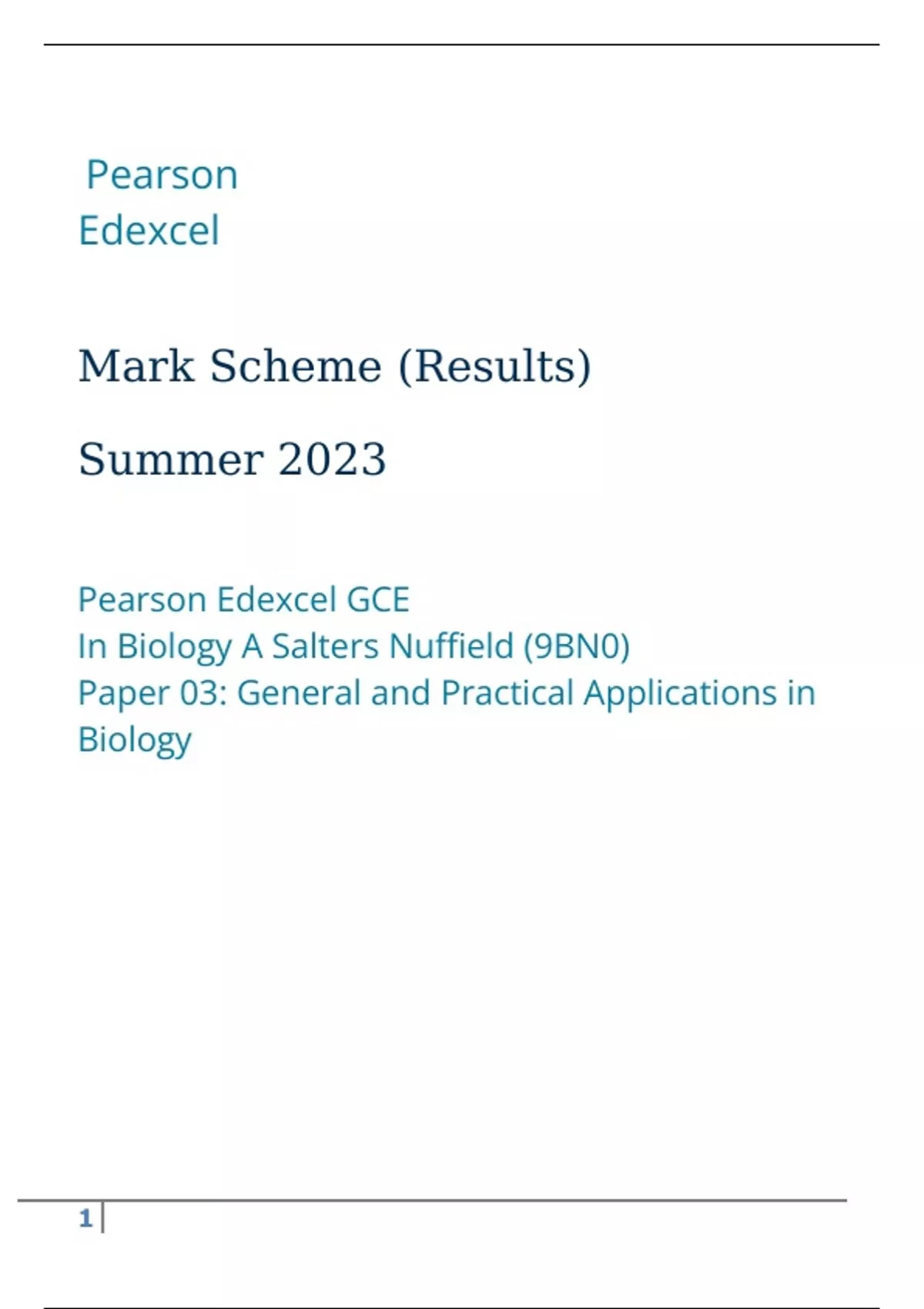 Pearson Edexcel GCE In Biology A (9BN0) Paper 03 General and Practical Applications in Biology Mark Scheme Results Summer 2023