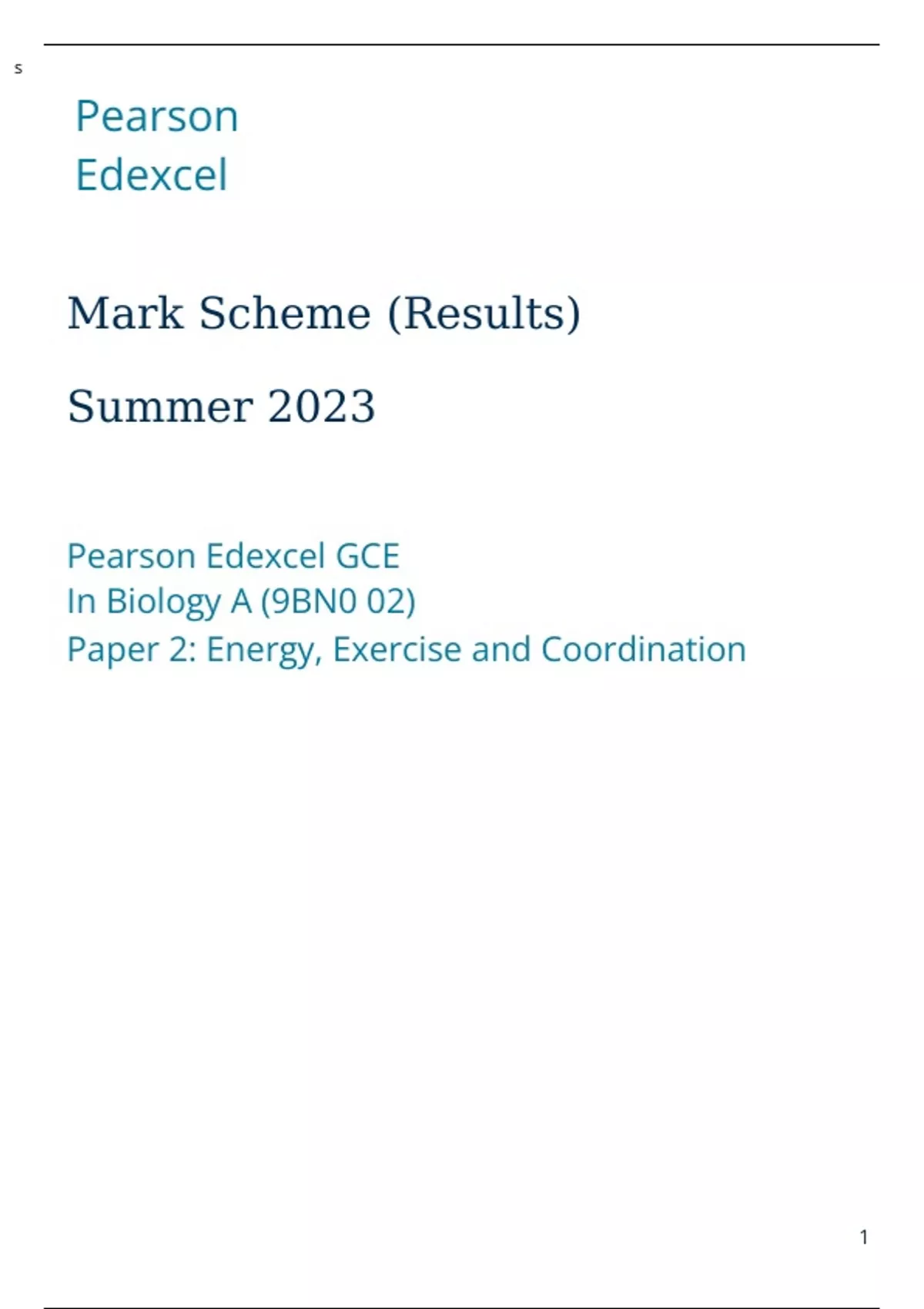 Pearson Edexcel GCE In Biology A (9BN0 02) Paper 2 Energy Exercise and Coordination Mark Scheme (Results) Summer 2023