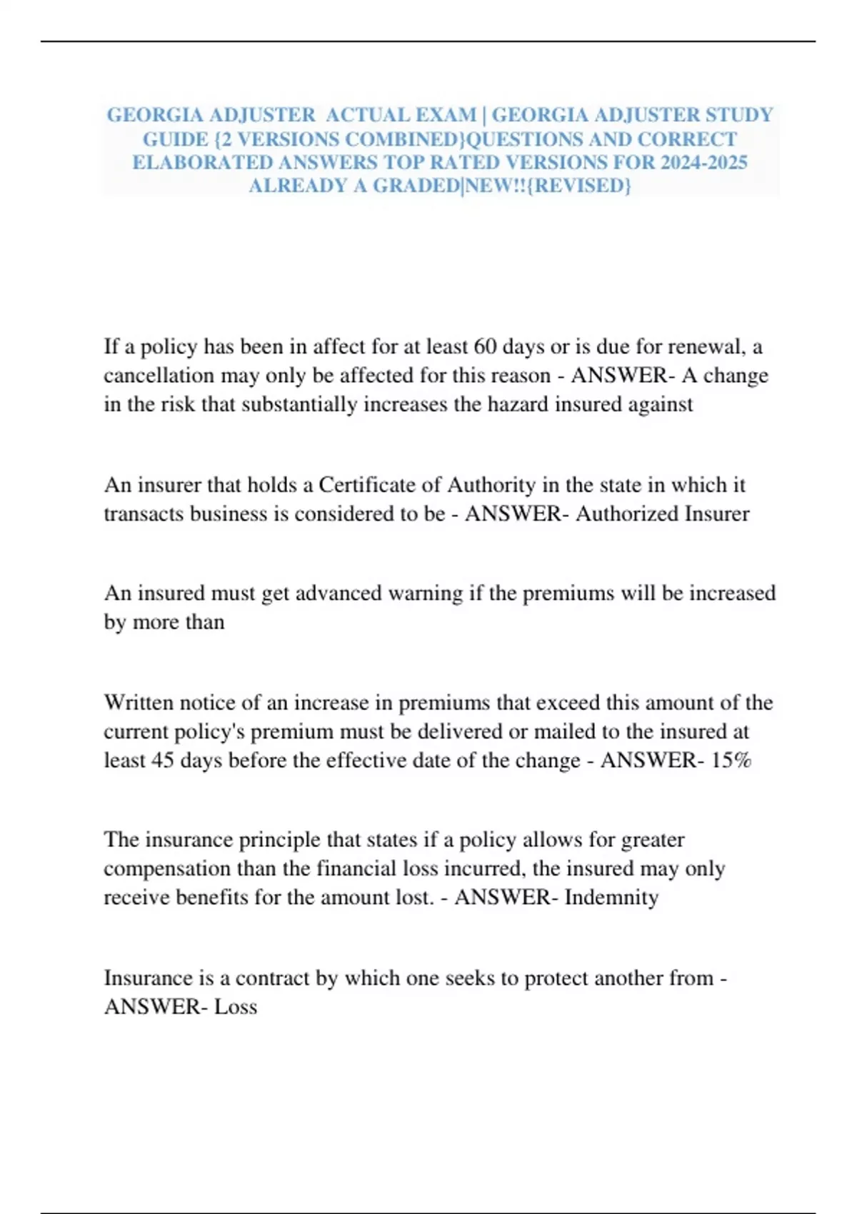 GEORGIA ADJUSTER ACTUAL EXAM | GEORGIA ADJUSTER STUDY GUIDE {2 VERSIONS COMBINED}QUESTIONS AND CORRECT ELABORATED ANSWERS TOP RATED VERSIONS FOR ALREADY A GRADED|NEW!!{REVISED}
