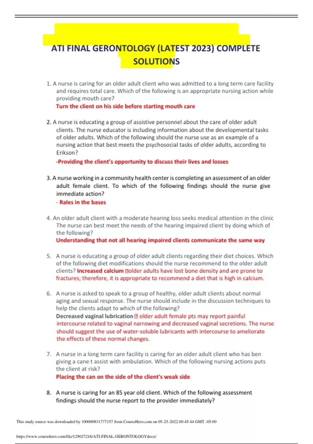 ATI FINAL GERONTOLOGY (LATEST 2023) COMPLETE SOLUTIONS 1. A nurse is caring for an older adult client who was admitted to a long term care facility and requires total care. Which of the following is an appropriate nursing action while providing mouth care? Turn the client on his side before starting mouth care 2. A nurse is educating a group of assistive personnel about the care of older adult clients. The nurse educator is including information about the developmental tasks of older adults. Which of the following should the nurse use as an example of a nursing action that best meets the psychosocial tasks of older adults, according to Erikson? -Providing the client’s opportunity to discuss their lives and losses
