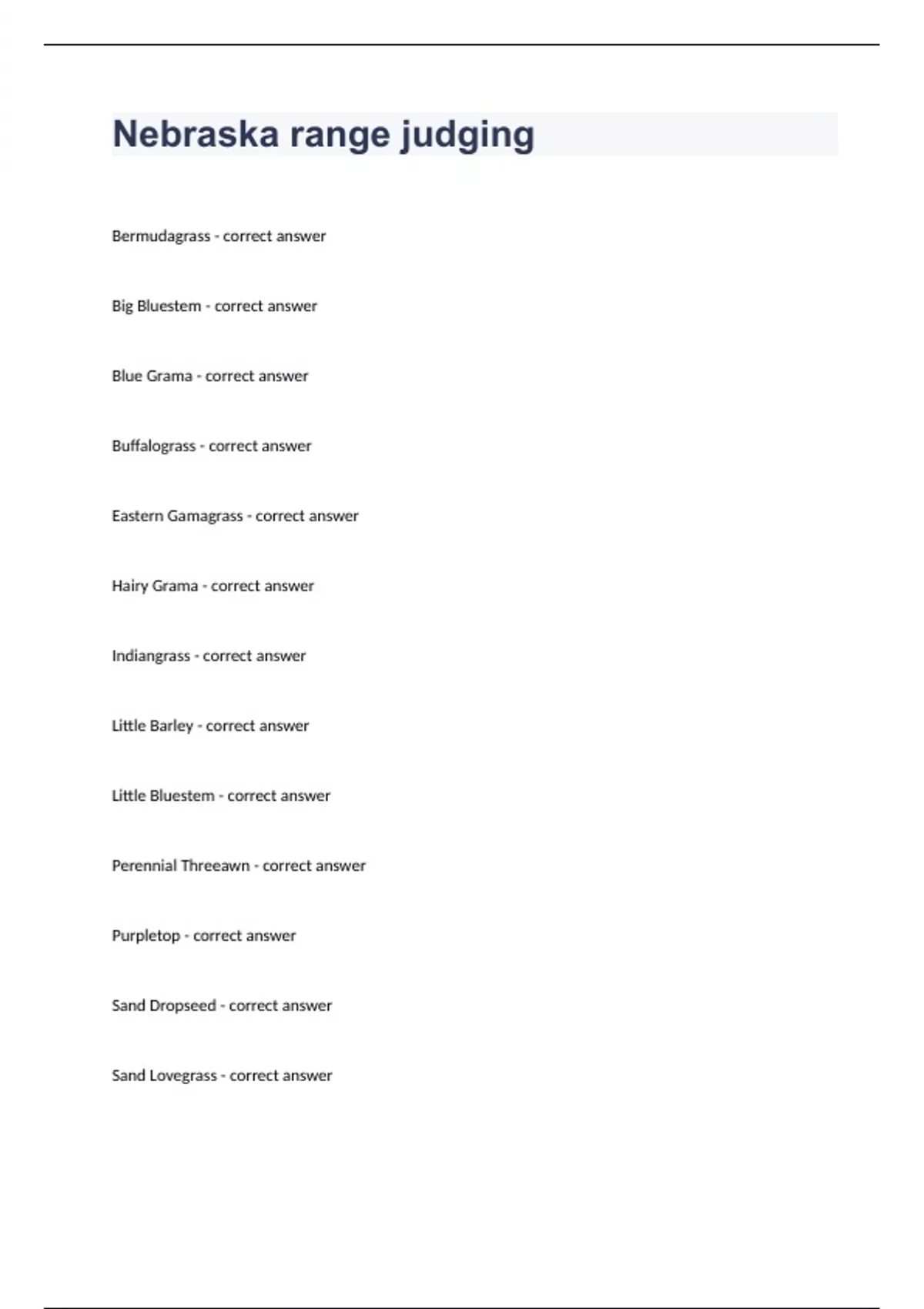 Nebraska range judging Question and answers 2023/2024 verified to passed Bermudagrass - correct answer Big Bluestem - correct answer Blue Grama - correct answer Buffalograss - correct answer Eastern Gamagrass - correct answer Hairy Grama - correct answer Indiangrass - correct a