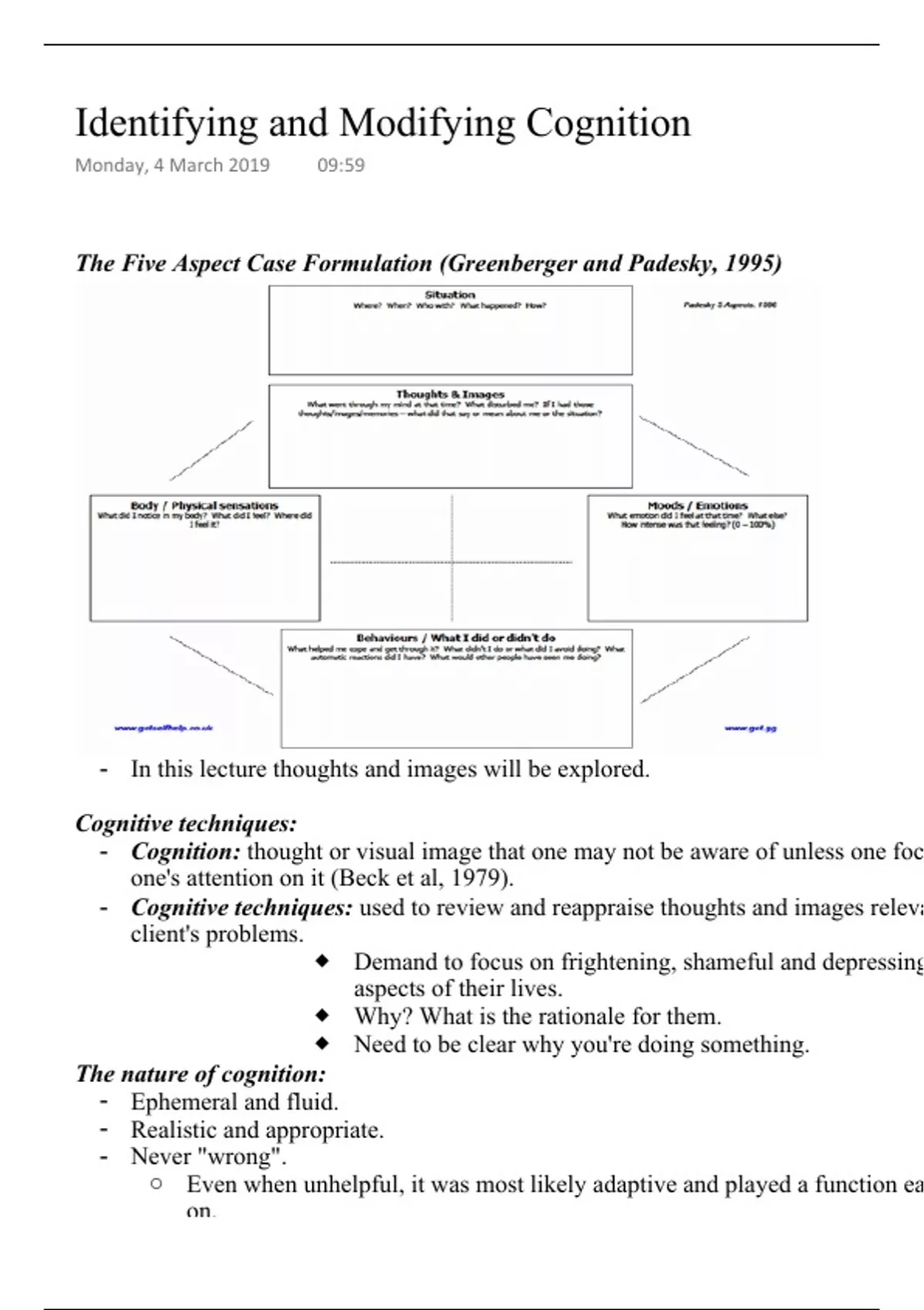 The Five Aspect Case Formulation (Greenberger and Padesky, 1995)